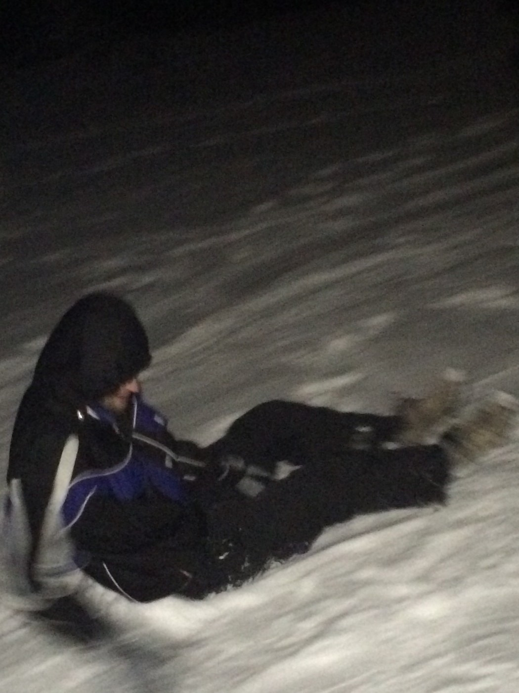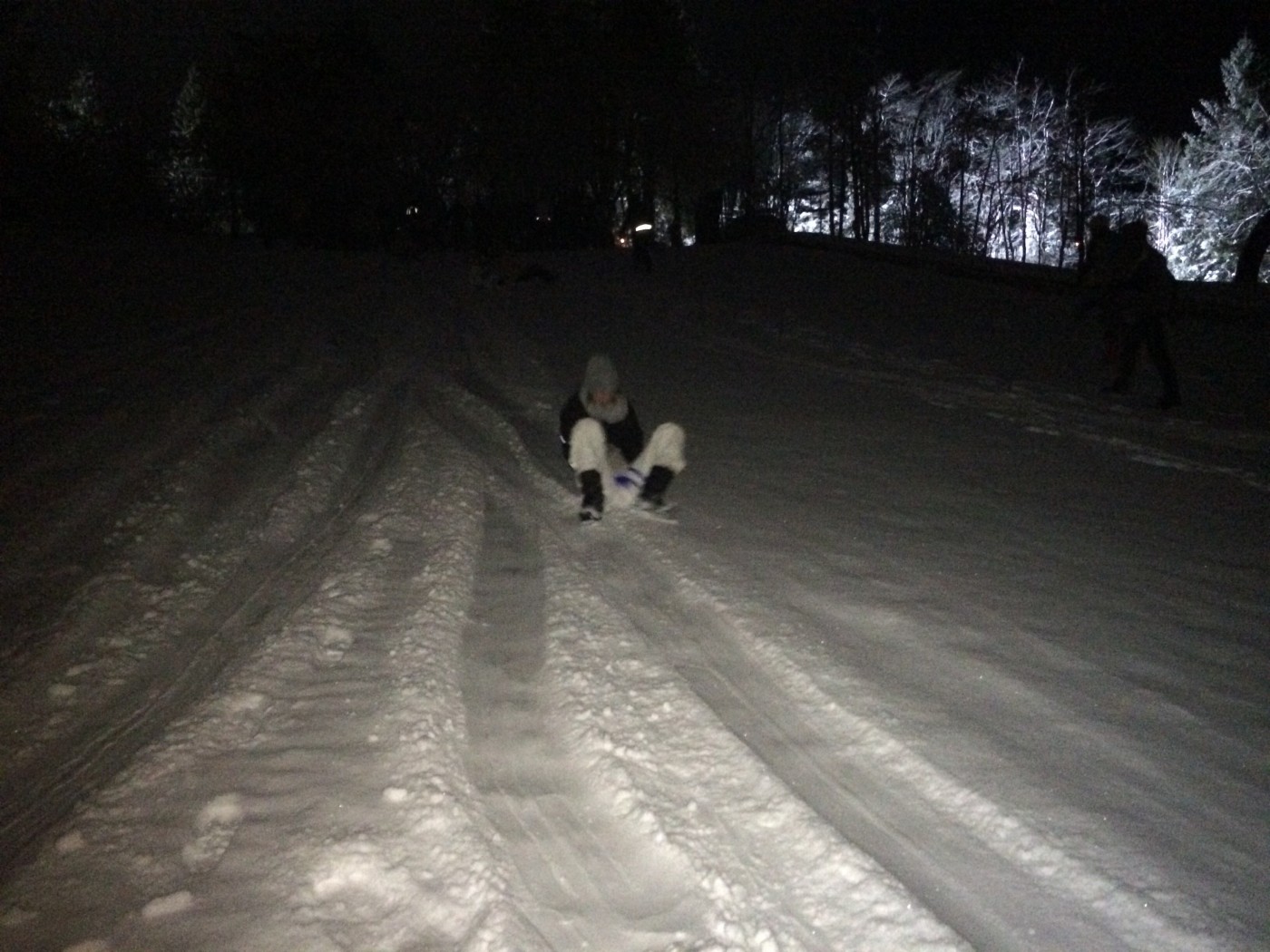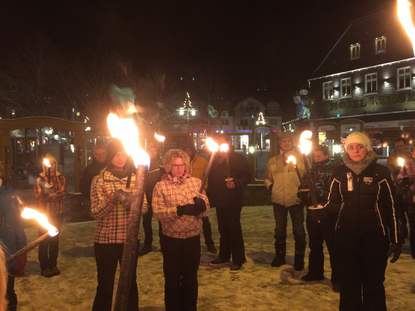 Reinders komt aan en het sneeuwt, heel Winterberg is wit. De fakkelwandeling was prachtig door het witte winterlandschap. En dolle pret met het bil sleeën bij het kampvuur.