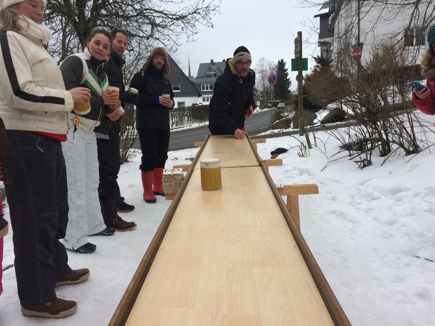 Bovenaan de piste was er een gelegenheid om op te warmen bij de vuurkorf, een lekkere glühwein of jagerthee te drinken en als klap op de vuurpijl het bil sleeën. Dit ging niet geheel zwijgzaam, de dames gierden het uit en het was tot ver in het dal te horen……