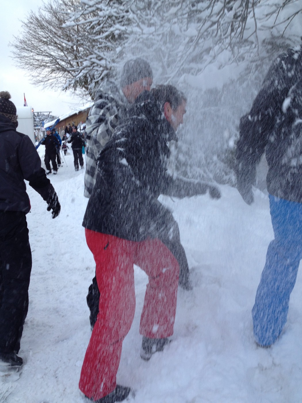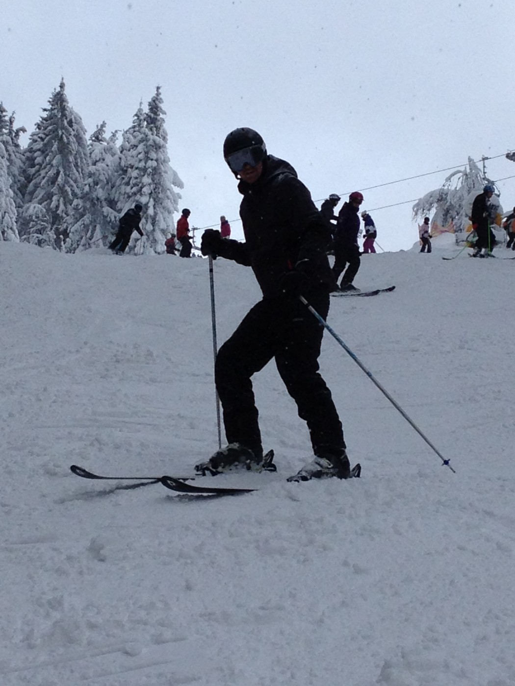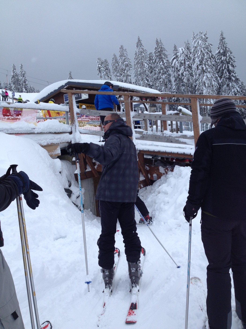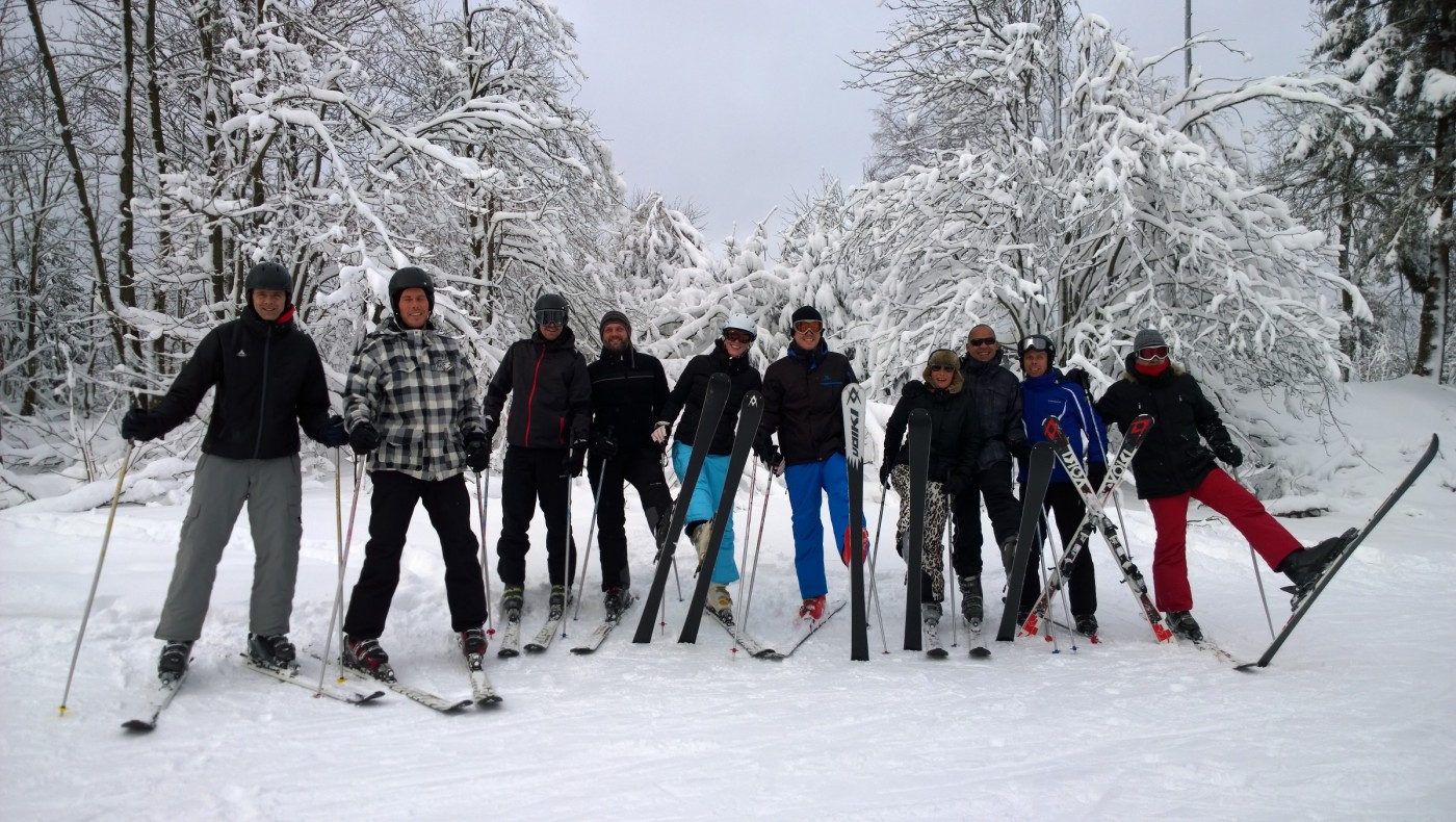 Expert stond de groep al op te wachten op de besneeuwde parkeerplaats bij de skiverhuur. Iets later dan verwacht kwamen zij aan maar het te laat komen mocht een goede reden hebben want het sneeuwde de ochtend flink door. Na snel een kop koffie gedronken te hebben is het skimateriaal bij elkaar gezocht en kon er met frisse zin richting de piste gegaan worden. Voor de ochtend werd er afgesproken dat de reeds ervaren skiërs het gebied alvast gingen verkennen zodat de 3 mannen die een sneltreincursus skiën voor beginners kregen s ’middags konden aansluiten bij de vriendengroep.