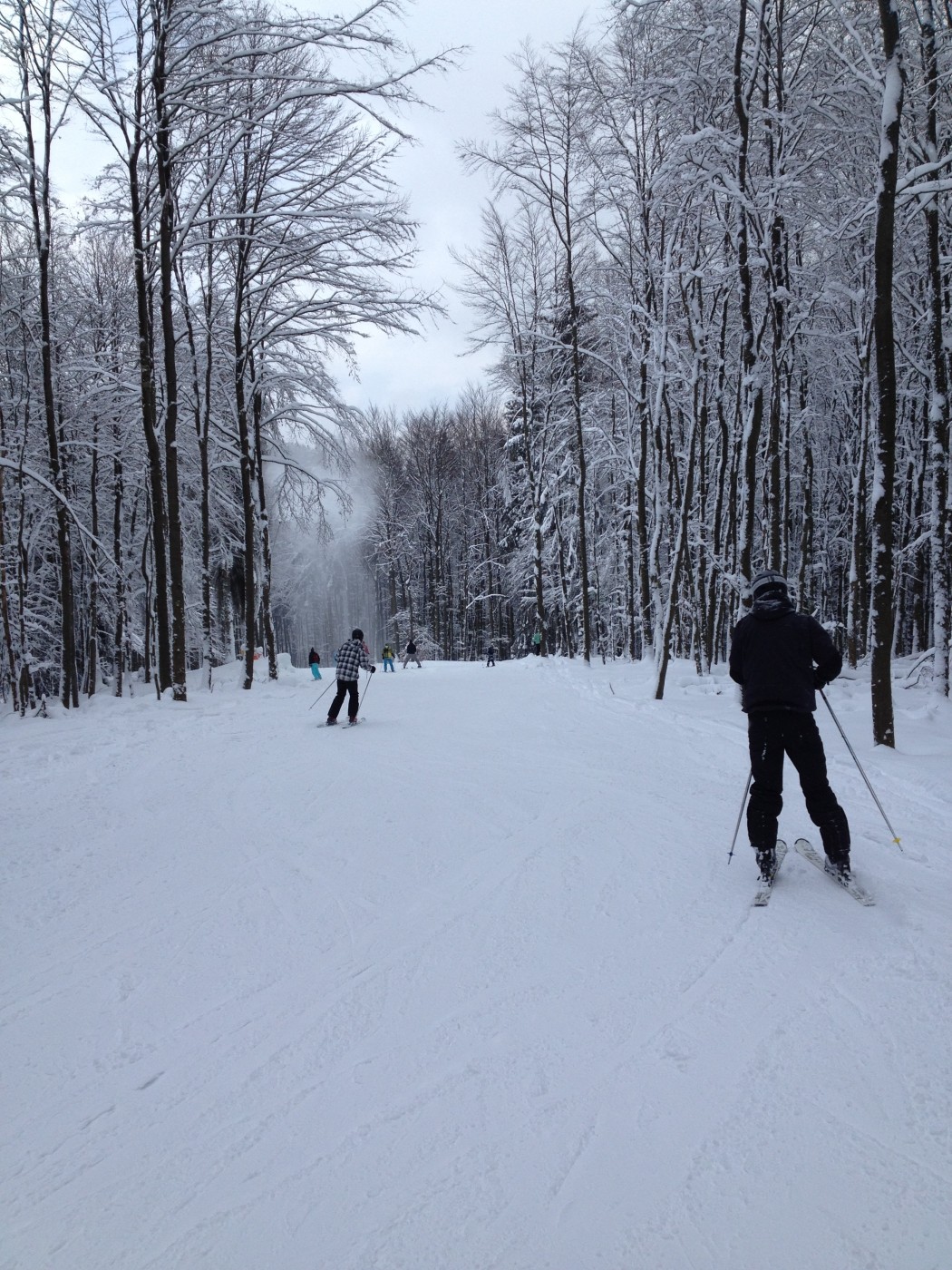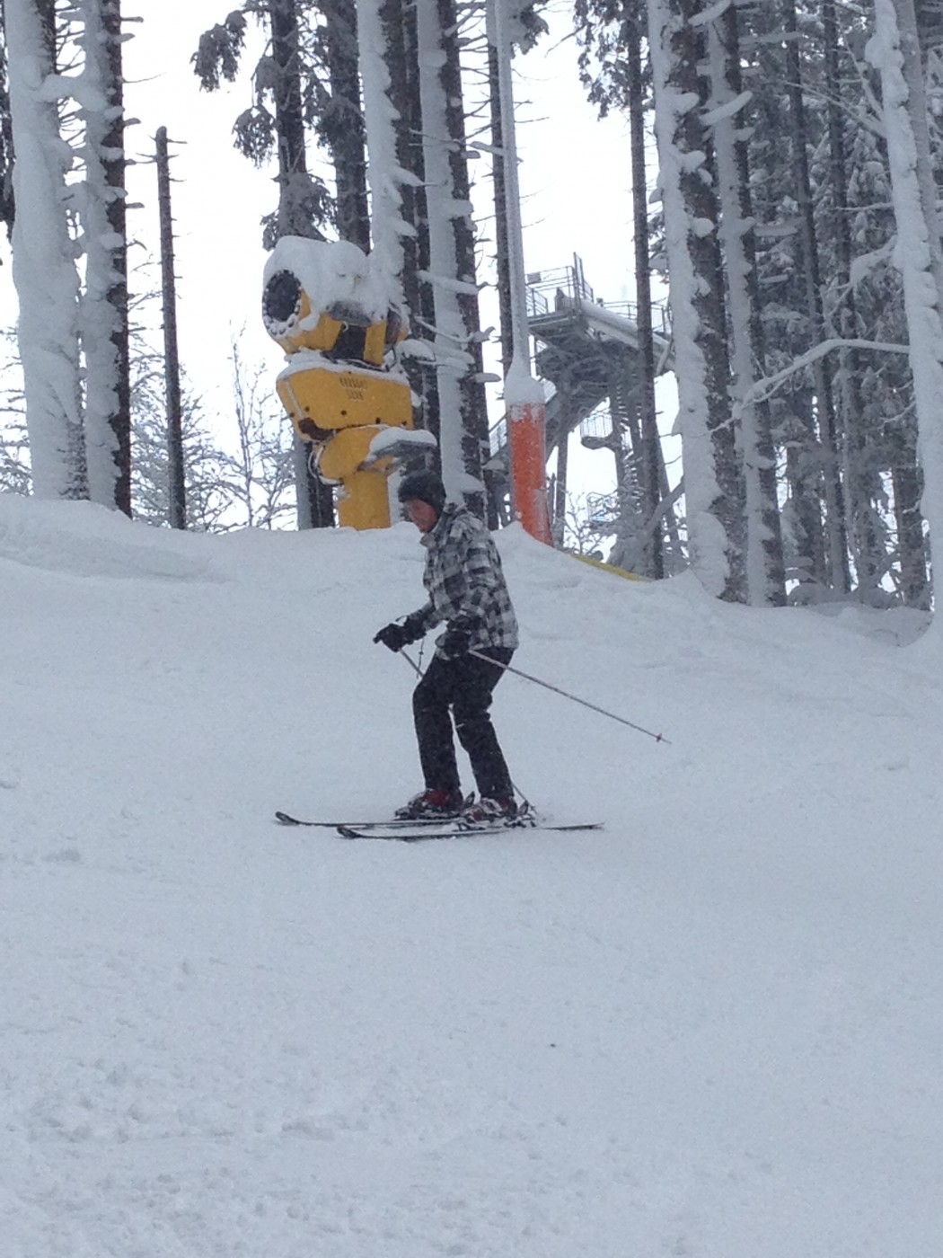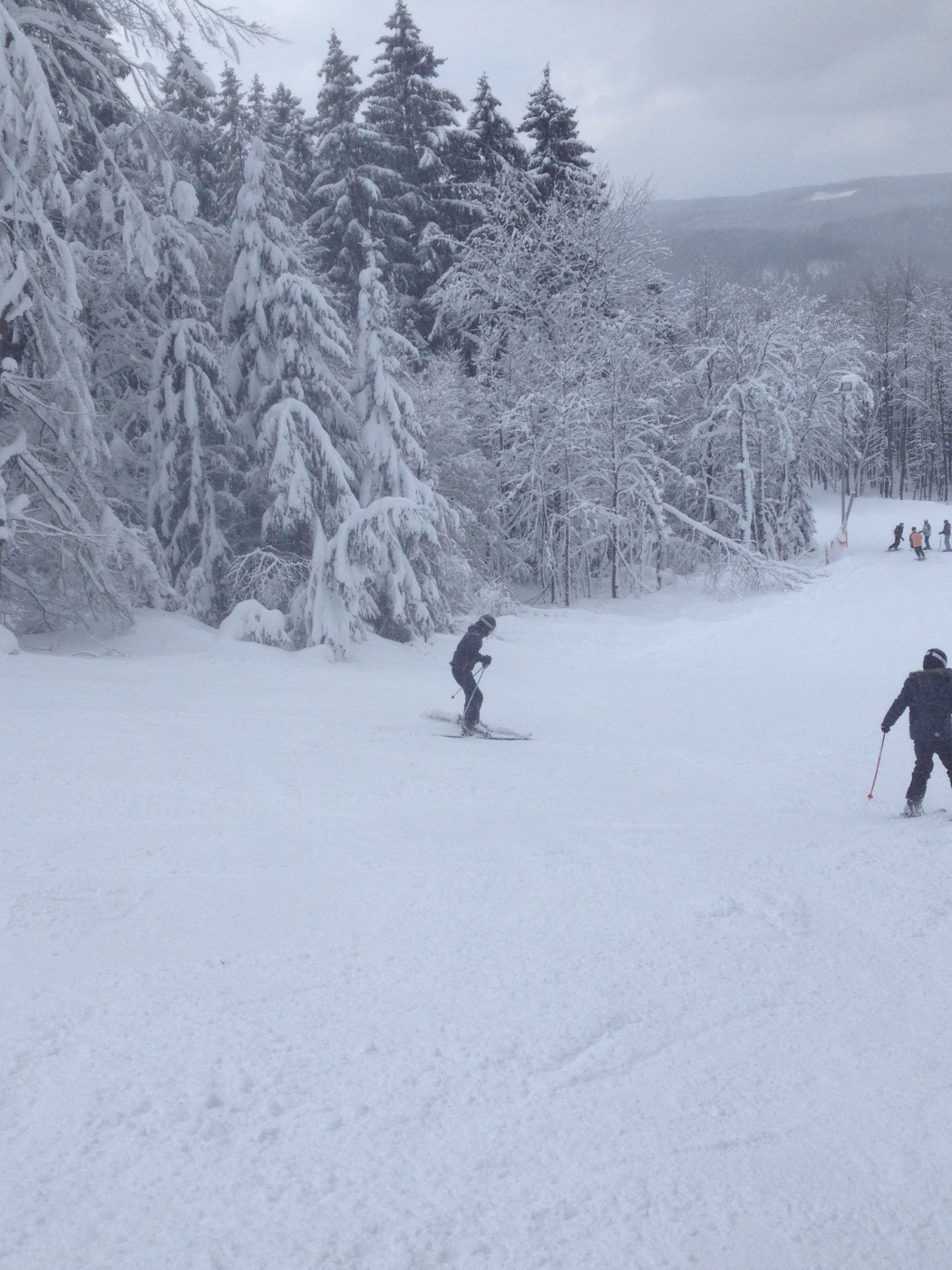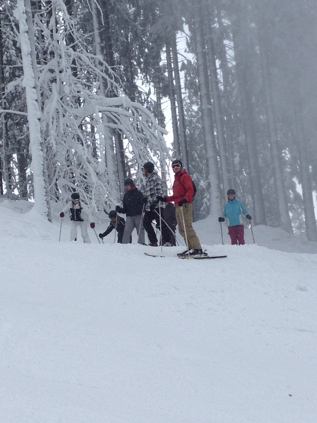 Expert stond de groep al op te wachten op de besneeuwde parkeerplaats bij de skiverhuur. Iets later dan verwacht kwamen zij aan maar het te laat komen mocht een goede reden hebben want het sneeuwde de ochtend flink door. Na snel een kop koffie gedronken te hebben is het skimateriaal bij elkaar gezocht en kon er met frisse zin richting de piste gegaan worden. Voor de ochtend werd er afgesproken dat de reeds ervaren skiërs het gebied alvast gingen verkennen zodat de 3 mannen die een sneltreincursus skiën voor beginners kregen s ’middags konden aansluiten bij de vriendengroep.