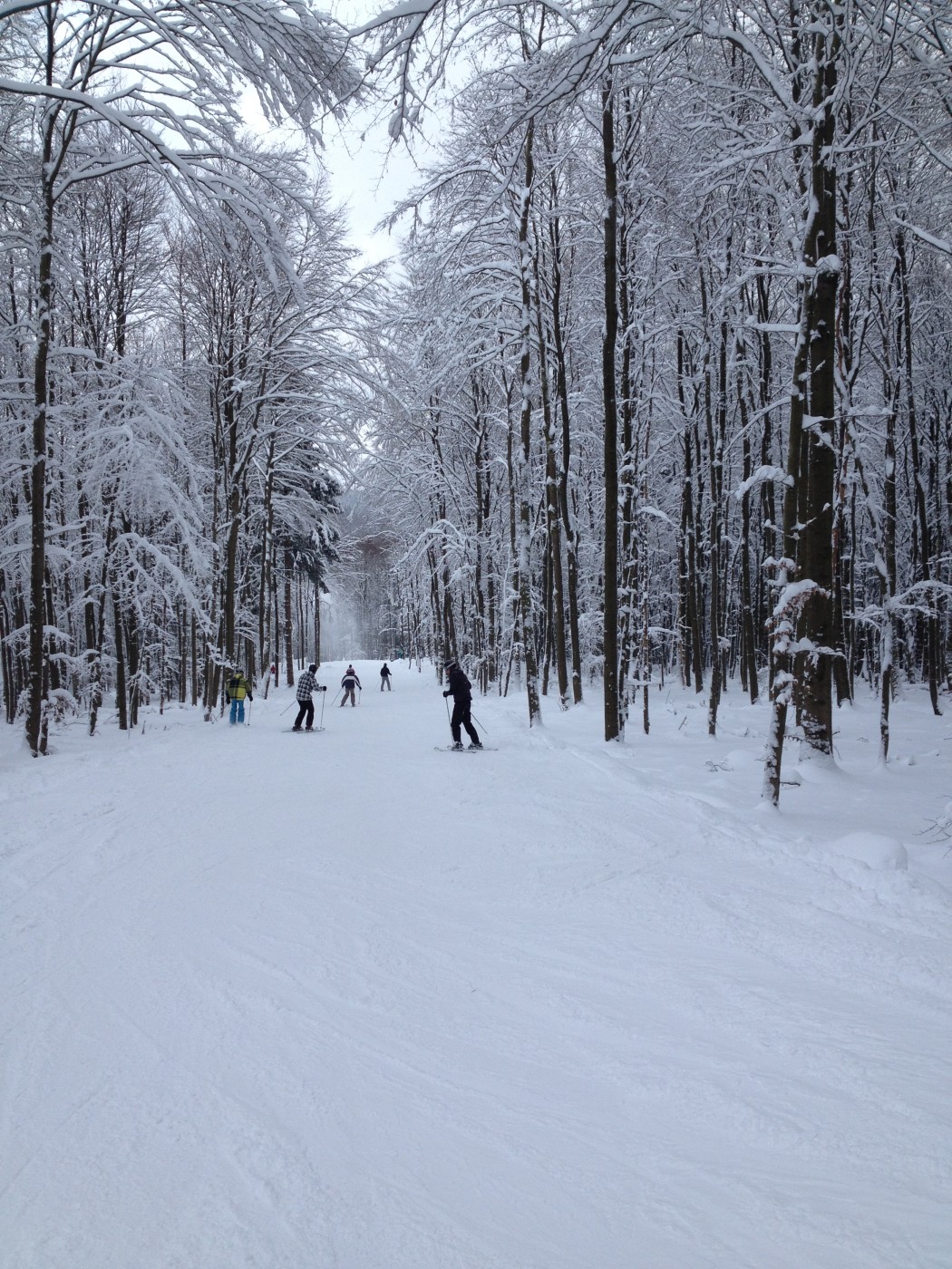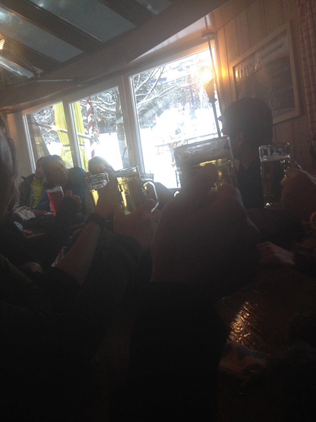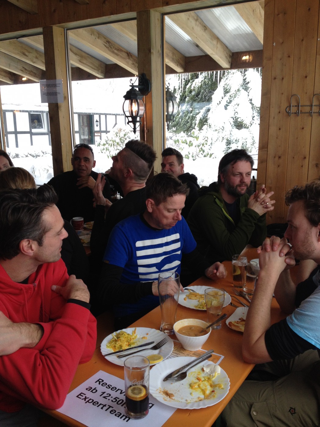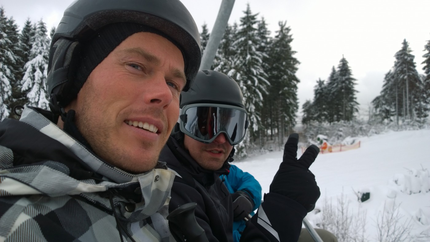 Om half 1 werd er geluncht bij de Rauher Busch en kwamen de eerste stoere verhalen op tafel. Het meest stoere verhaal (berust op waarheid) is dan wel dat de 3 mannen die bij Arjen en Danielle achter bleven, in 2 uur tijd waren doorgegroeid van beginners tot gevorderde skiërs. De rest van de groep wilde dat natuurlijk eerst met eigen ogen zien en dat hebben ze geweten…in 2 uurtjes tijd hebben we met zijn allen het hele gebied van Winterberg doorkruist en is zelfs nog door een aantal de zwarte piste bedwongen.