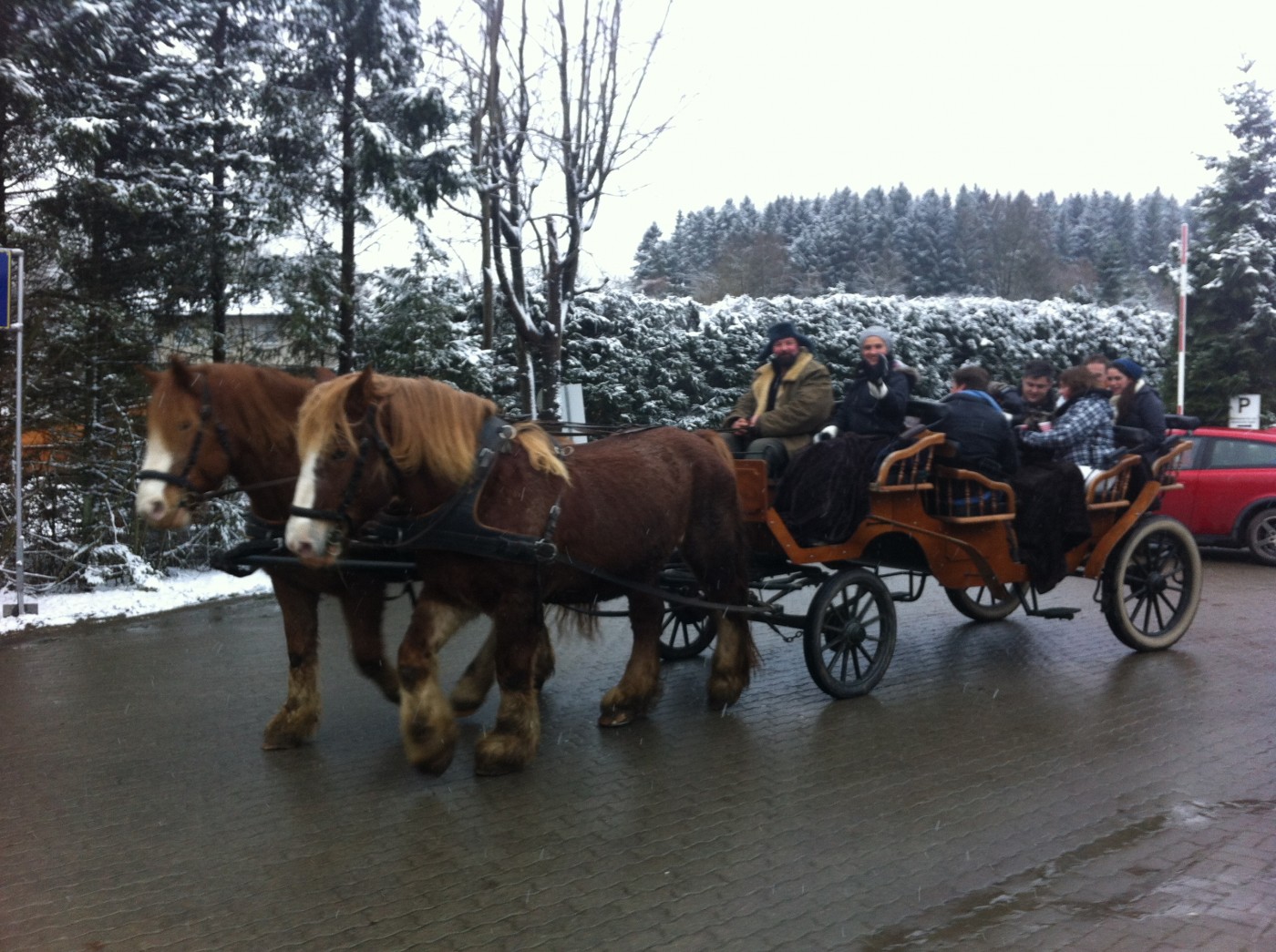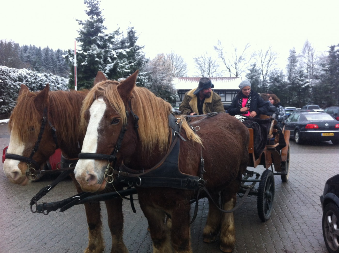 Ook heeft een deel van de groep mogen genieten van een tocht per koets met twee prachtige grote paarden er voor gespannen.