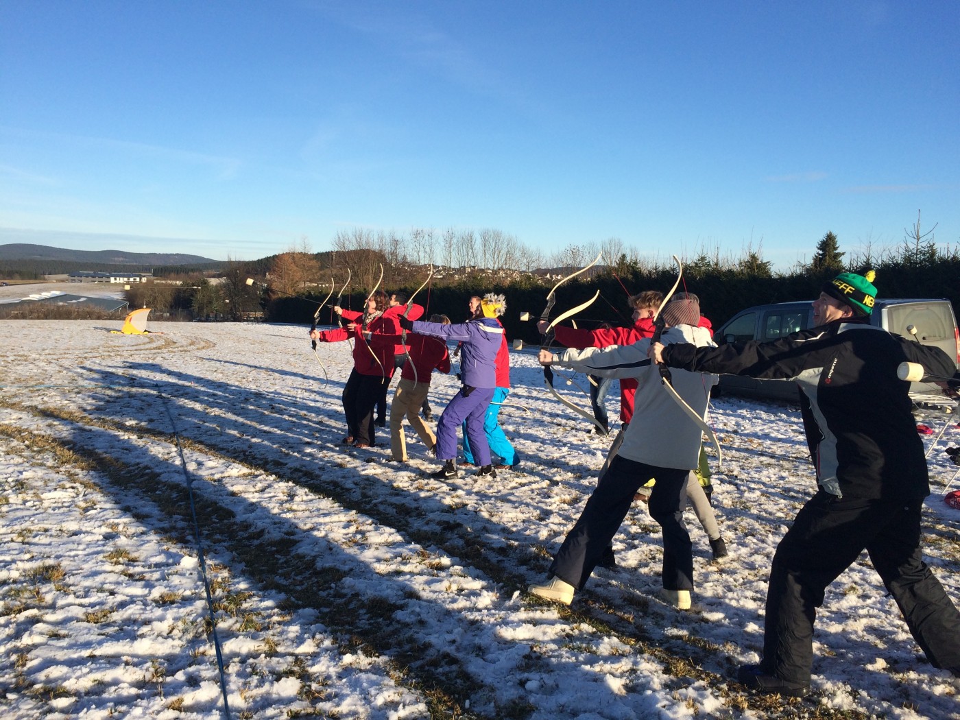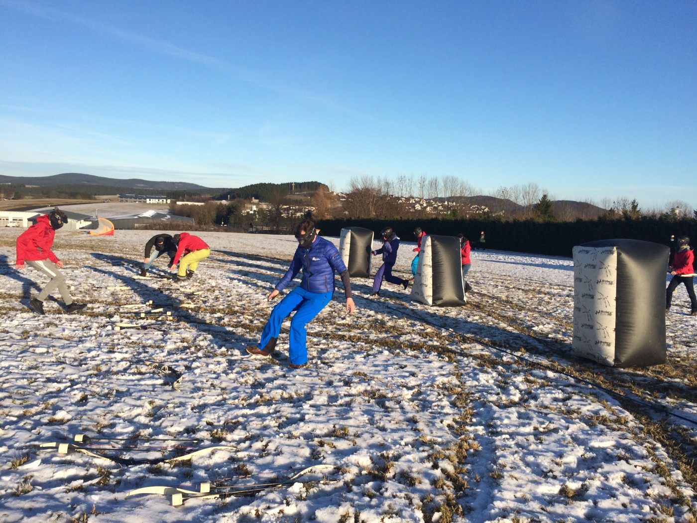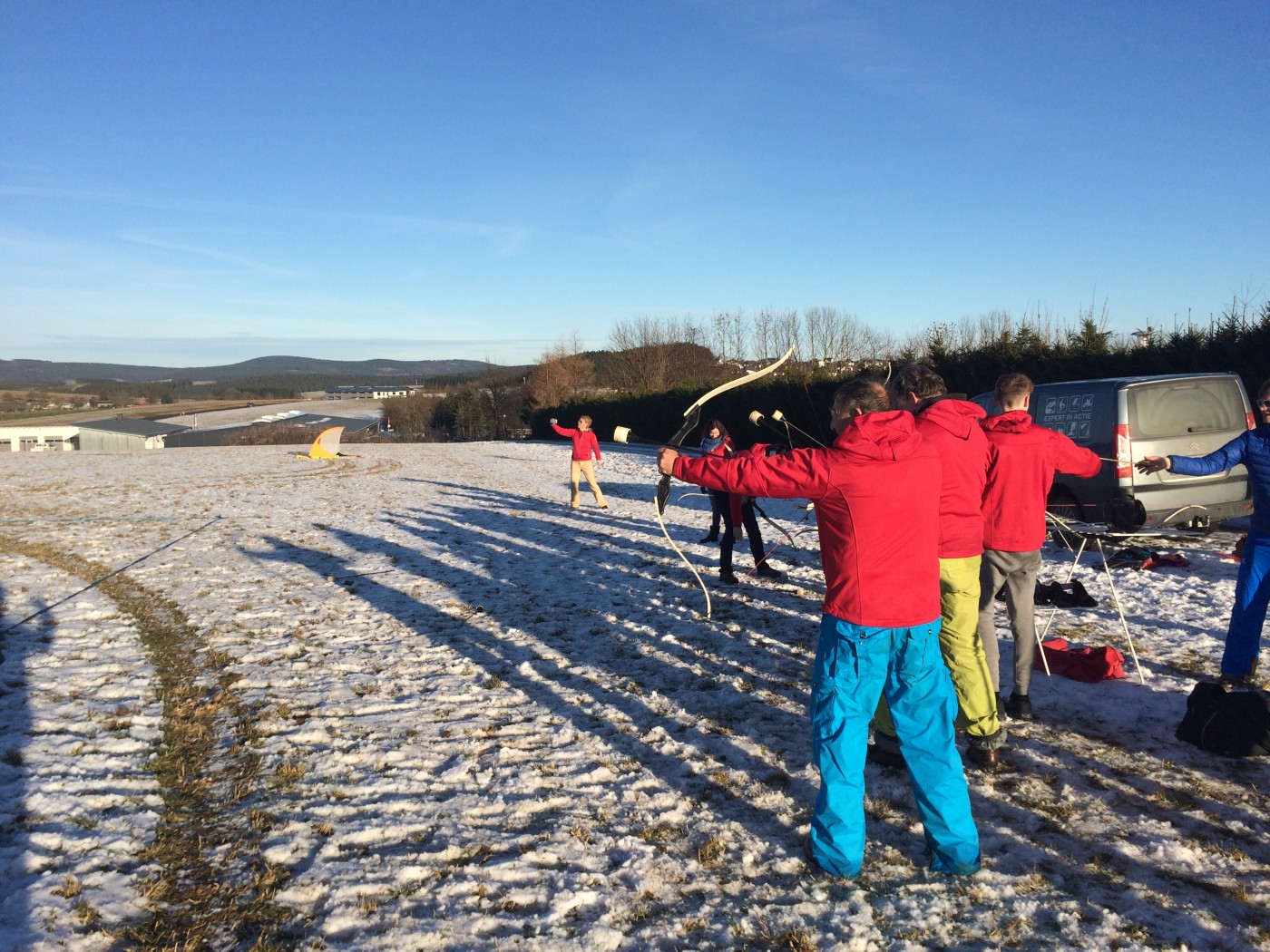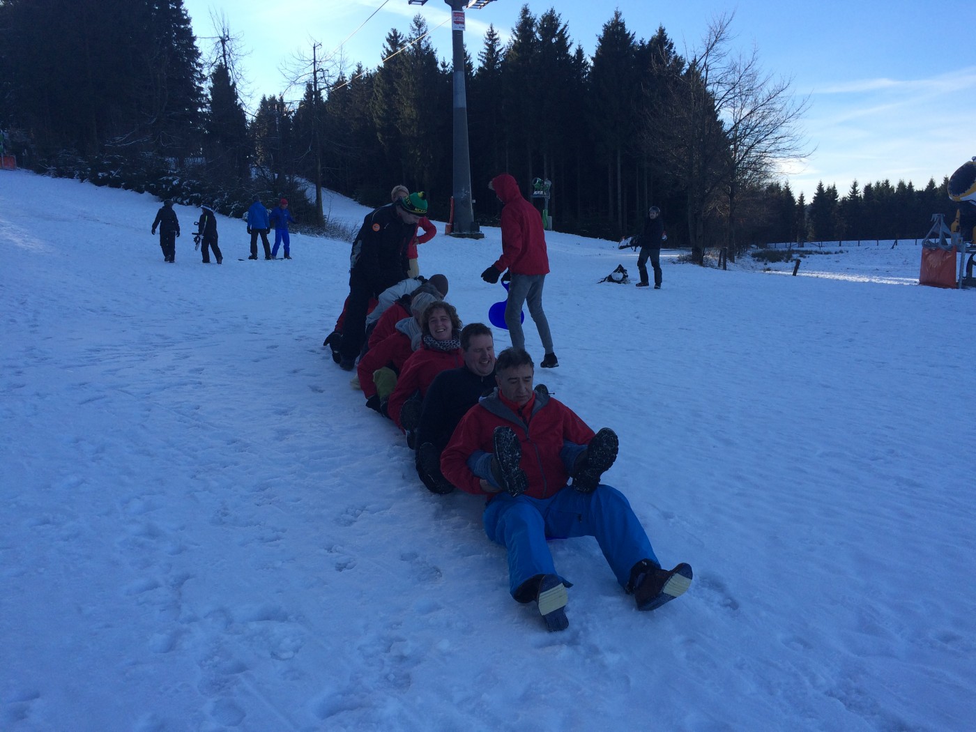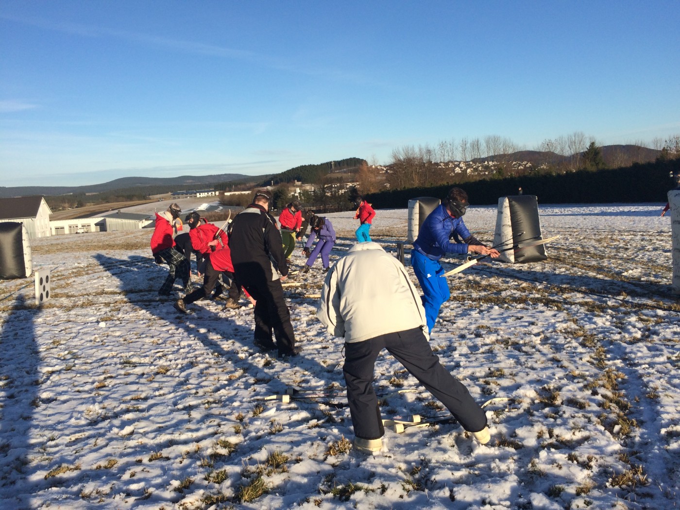 Na de lunch nemen sommige toch nog een extra lesje bij Jop of Sofia en de anderen gaan mee op een mooie wandeltocht naar de schans. Hier heb je een geweldig uitzicht over heel Winterberg en de Bobbaan. Over de piste gaan we natuurlijk niet terug wandelen want we hebben de bilslee mee. Tijd voor de grote bilslee wedstrijd. Mario lag eerst op kop maar werd toch ingehaald door de slee profi Renate. Maar zij kon later weer terug gepakt worden bij het spannende ArcheryTag. Eerst waren Paul en Robbie de klos om als aas te gaan staan maar gelukkig waren zij goed in pijlen vangen en mochten zij in no time ook weer schieten op hun collega’s. Een paar spannende potjes Archerytag gespeeld en daarna tijd voor de apres ski.