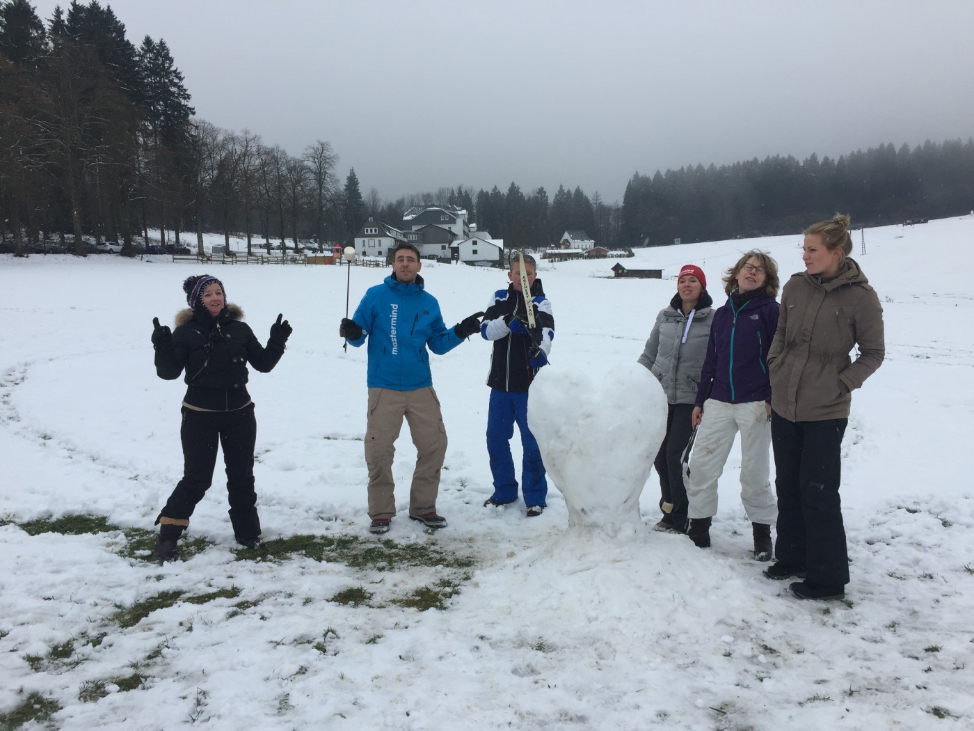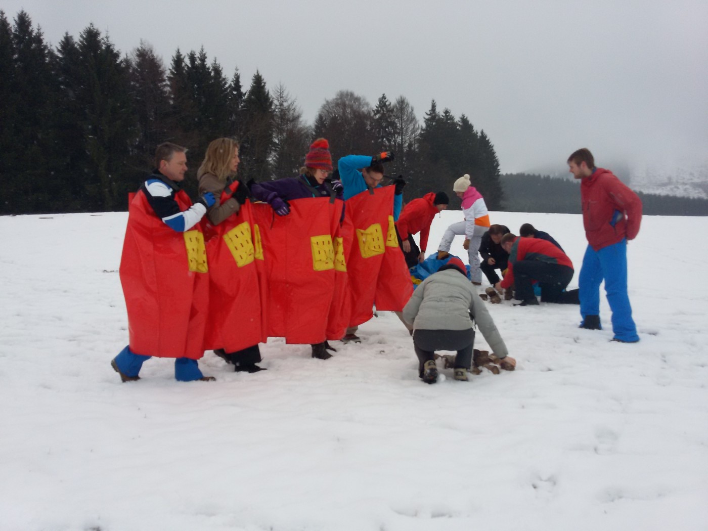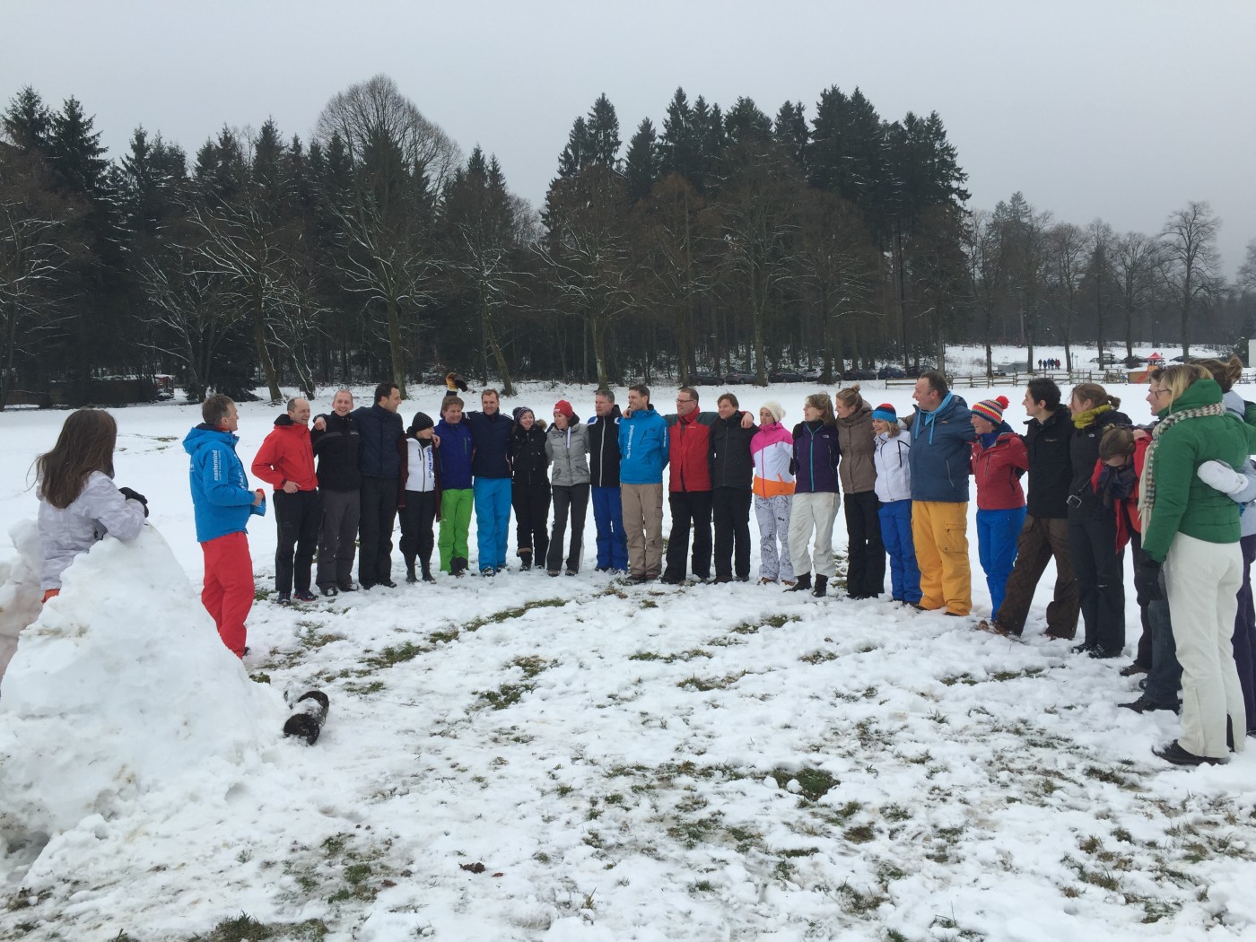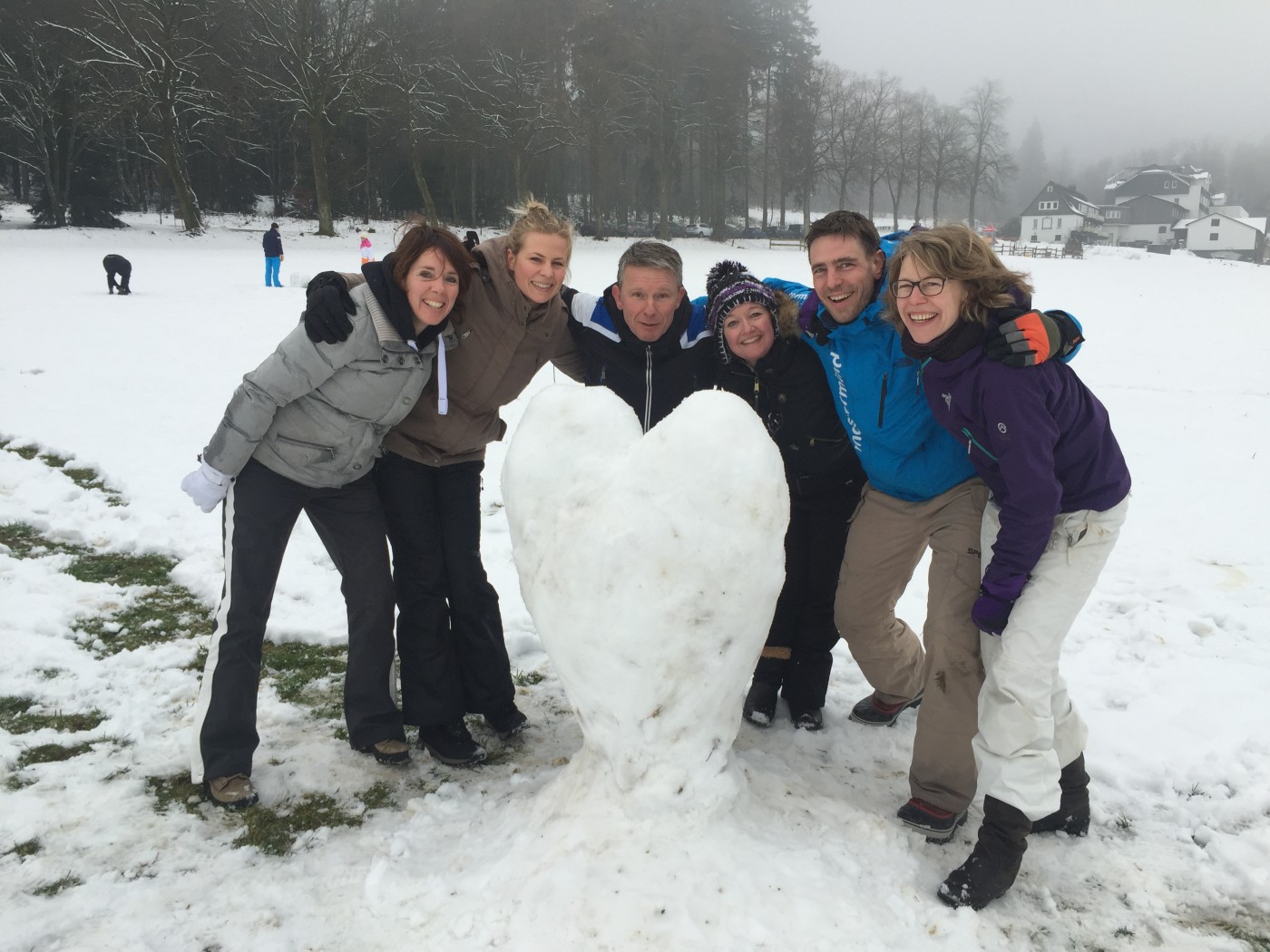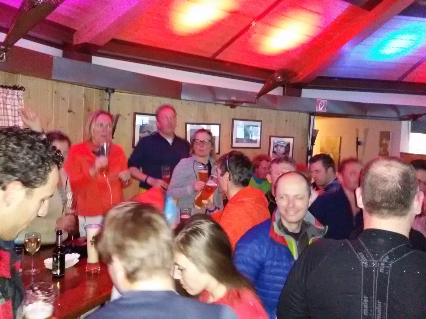 Velen waren maar nét op tijd om nog mee te kunnen feesten bij de après-ski, voor de bus weer naar het hotel ging om op te frissen voor het avondeten. Aansluitend nog een feestje bij Volldampf in Winterberg. En dan moe, maar voldaan naar bed. De volgende ochtend een sneeuwolympiade. Ik hoorde een hoop gekreun en gesteun bij het uitstappen van de auto’s… Stijf, spierpijn en waarschijnlijk had iedereen wel wat langer kunnen slapen. Maar eenmaal aan de gang met de spellen was dat allemaal snel vergeten. Wat een fanatisme! Iedereen was direct weer klaarwakker en actief/creatief.