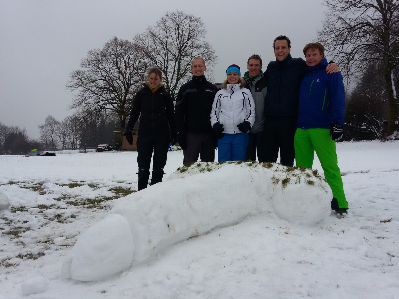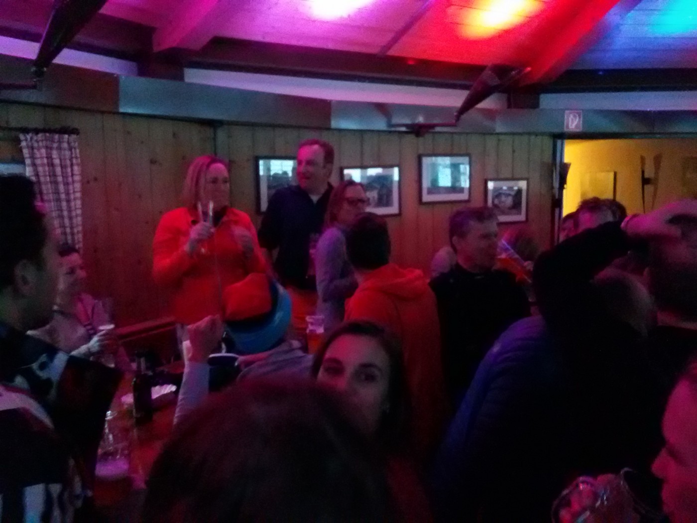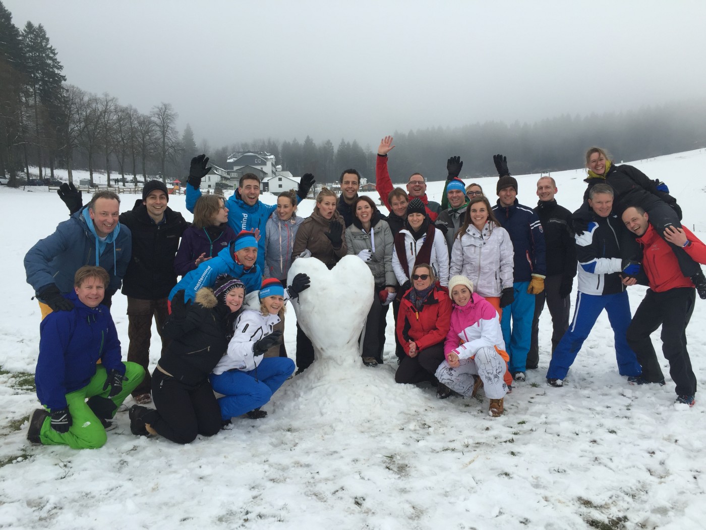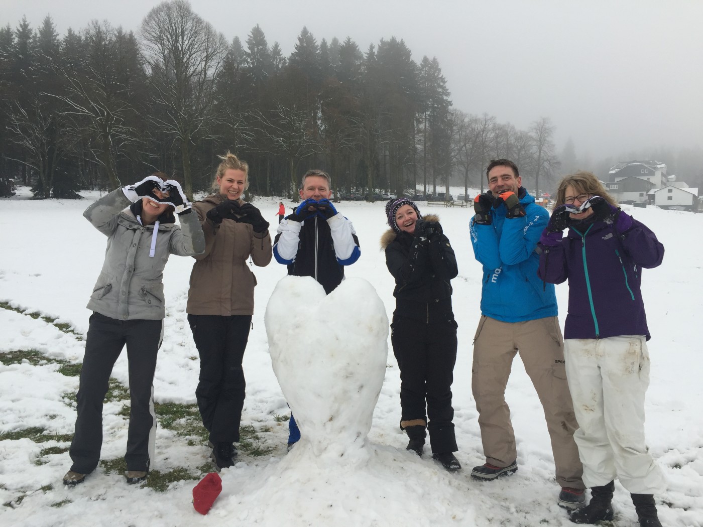 Velen waren maar nét op tijd om nog mee te kunnen feesten bij de après-ski, voor de bus weer naar het hotel ging om op te frissen voor het avondeten. Aansluitend nog een feestje bij Volldampf in Winterberg. En dan moe, maar voldaan naar bed. De volgende ochtend een sneeuwolympiade. Ik hoorde een hoop gekreun en gesteun bij het uitstappen van de auto’s… Stijf, spierpijn en waarschijnlijk had iedereen wel wat langer kunnen slapen. Maar eenmaal aan de gang met de spellen was dat allemaal snel vergeten. Wat een fanatisme! Iedereen was direct weer klaarwakker en actief/creatief.