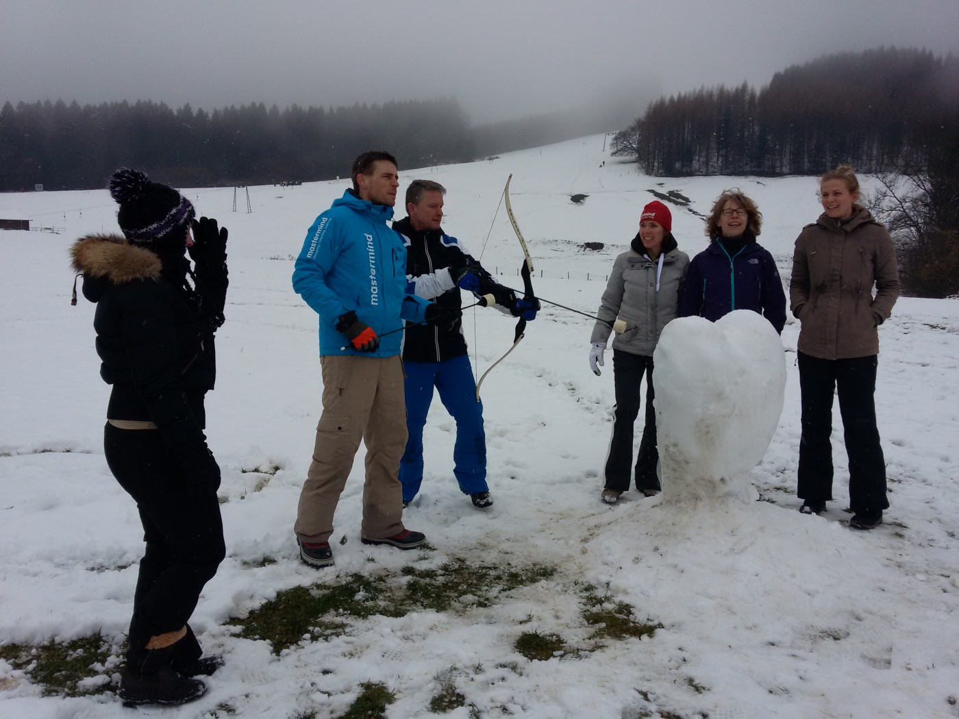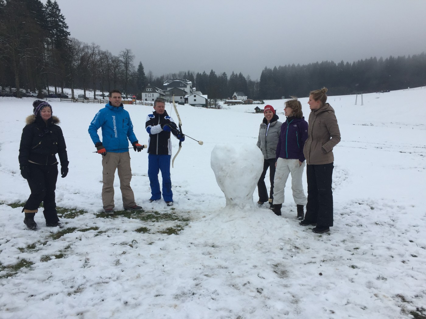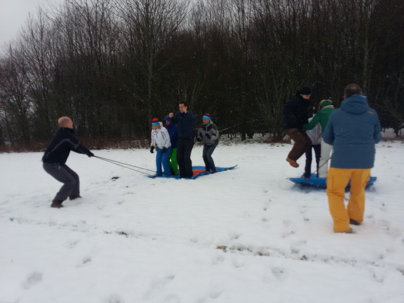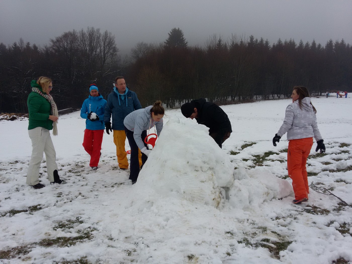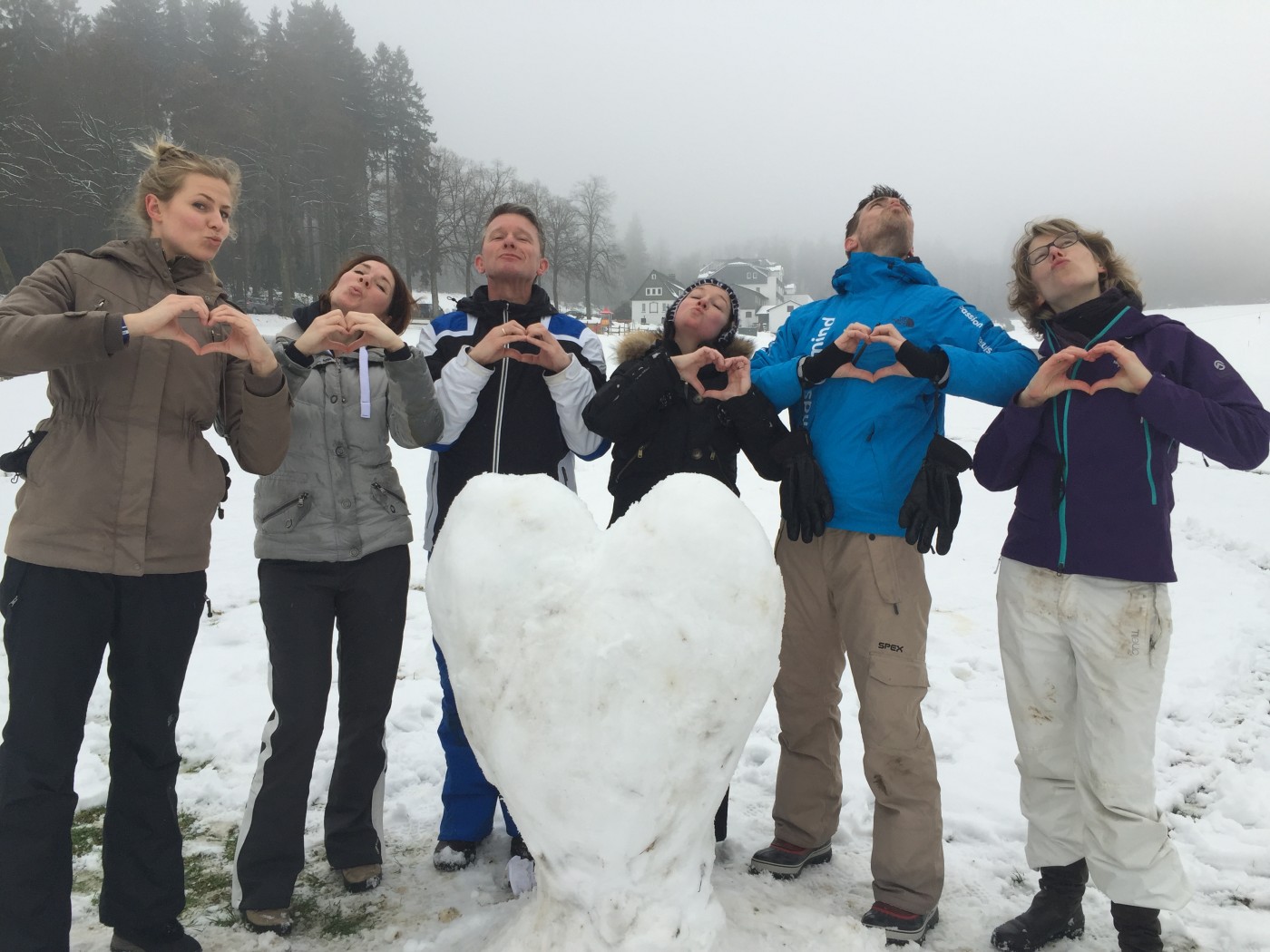 Velen waren maar nét op tijd om nog mee te kunnen feesten bij de après-ski, voor de bus weer naar het hotel ging om op te frissen voor het avondeten. Aansluitend nog een feestje bij Volldampf in Winterberg. En dan moe, maar voldaan naar bed. De volgende ochtend een sneeuwolympiade. Ik hoorde een hoop gekreun en gesteun bij het uitstappen van de auto’s… Stijf, spierpijn en waarschijnlijk had iedereen wel wat langer kunnen slapen. Maar eenmaal aan de gang met de spellen was dat allemaal snel vergeten. Wat een fanatisme! Iedereen was direct weer klaarwakker en actief/creatief.
