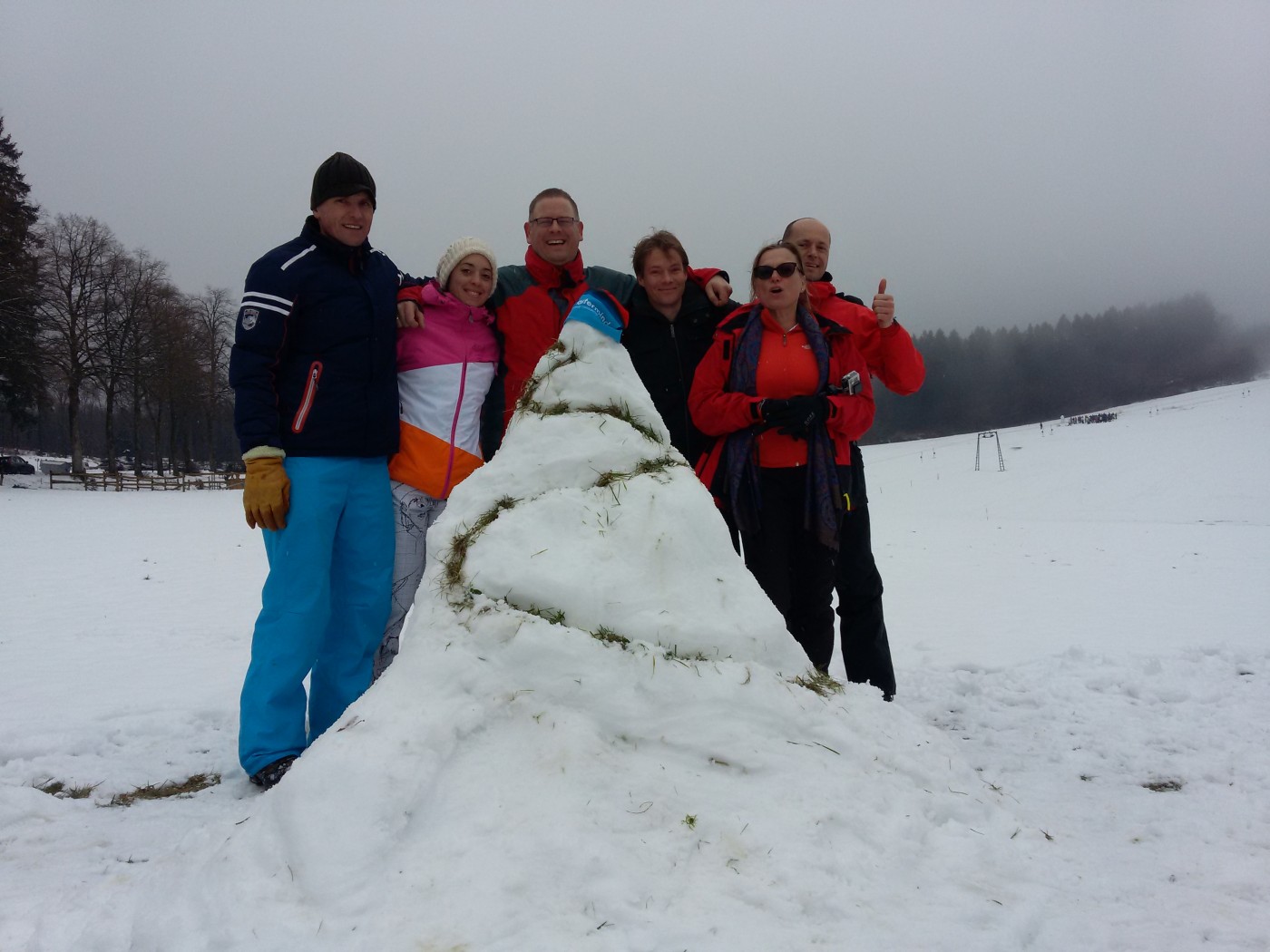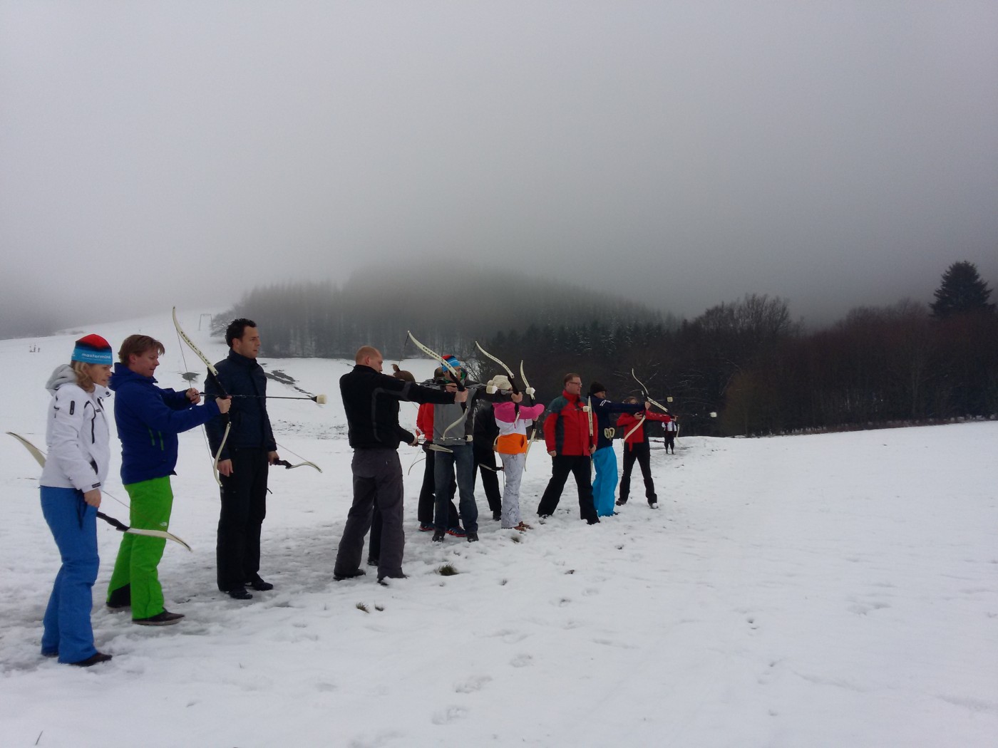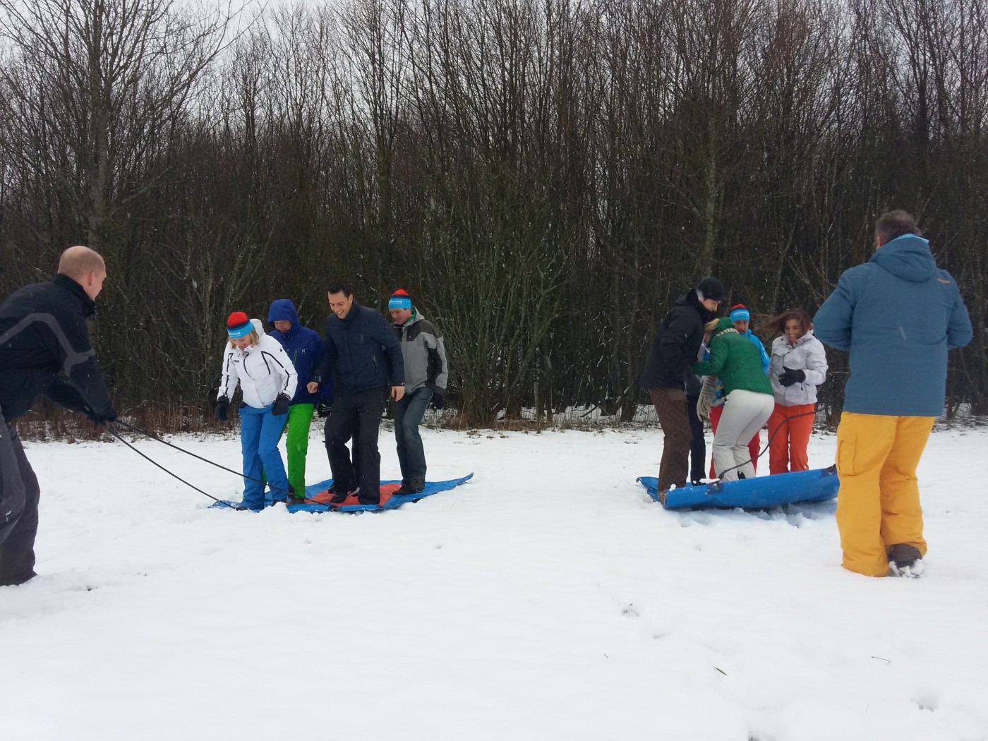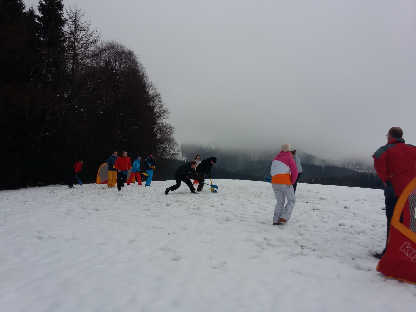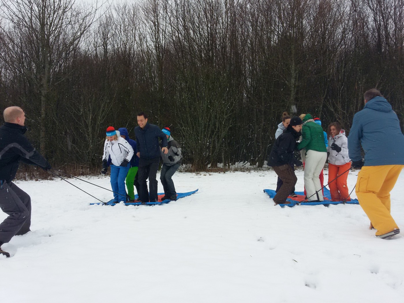 Velen waren maar nét op tijd om nog mee te kunnen feesten bij de après-ski, voor de bus weer naar het hotel ging om op te frissen voor het avondeten. Aansluitend nog een feestje bij Volldampf in Winterberg. En dan moe, maar voldaan naar bed. De volgende ochtend een sneeuwolympiade. Ik hoorde een hoop gekreun en gesteun bij het uitstappen van de auto’s… Stijf, spierpijn en waarschijnlijk had iedereen wel wat langer kunnen slapen. Maar eenmaal aan de gang met de spellen was dat allemaal snel vergeten. Wat een fanatisme! Iedereen was direct weer klaarwakker en actief/creatief.