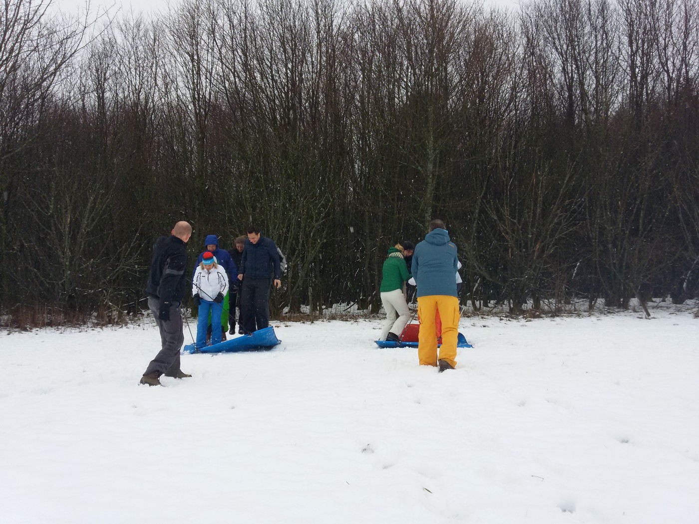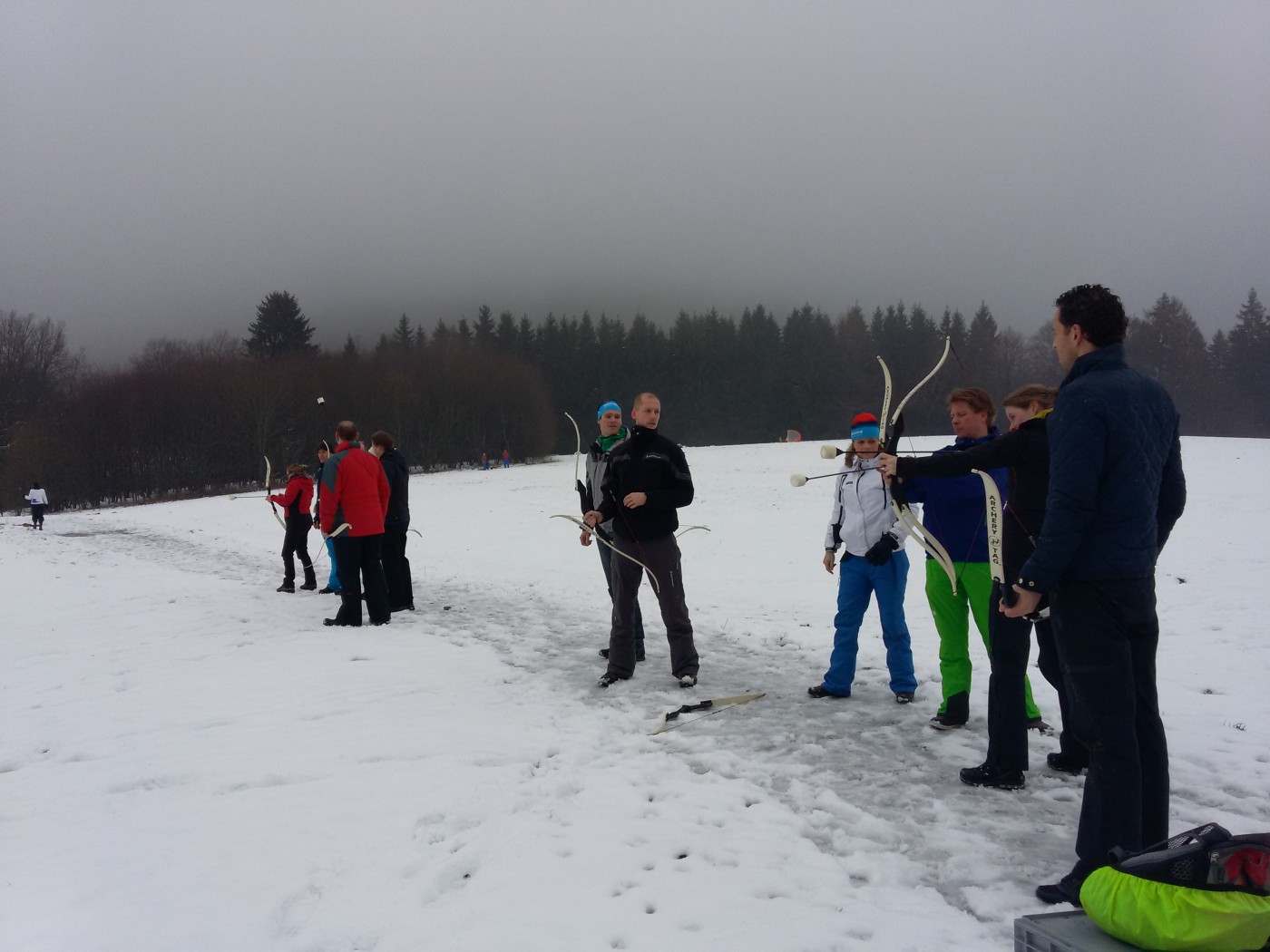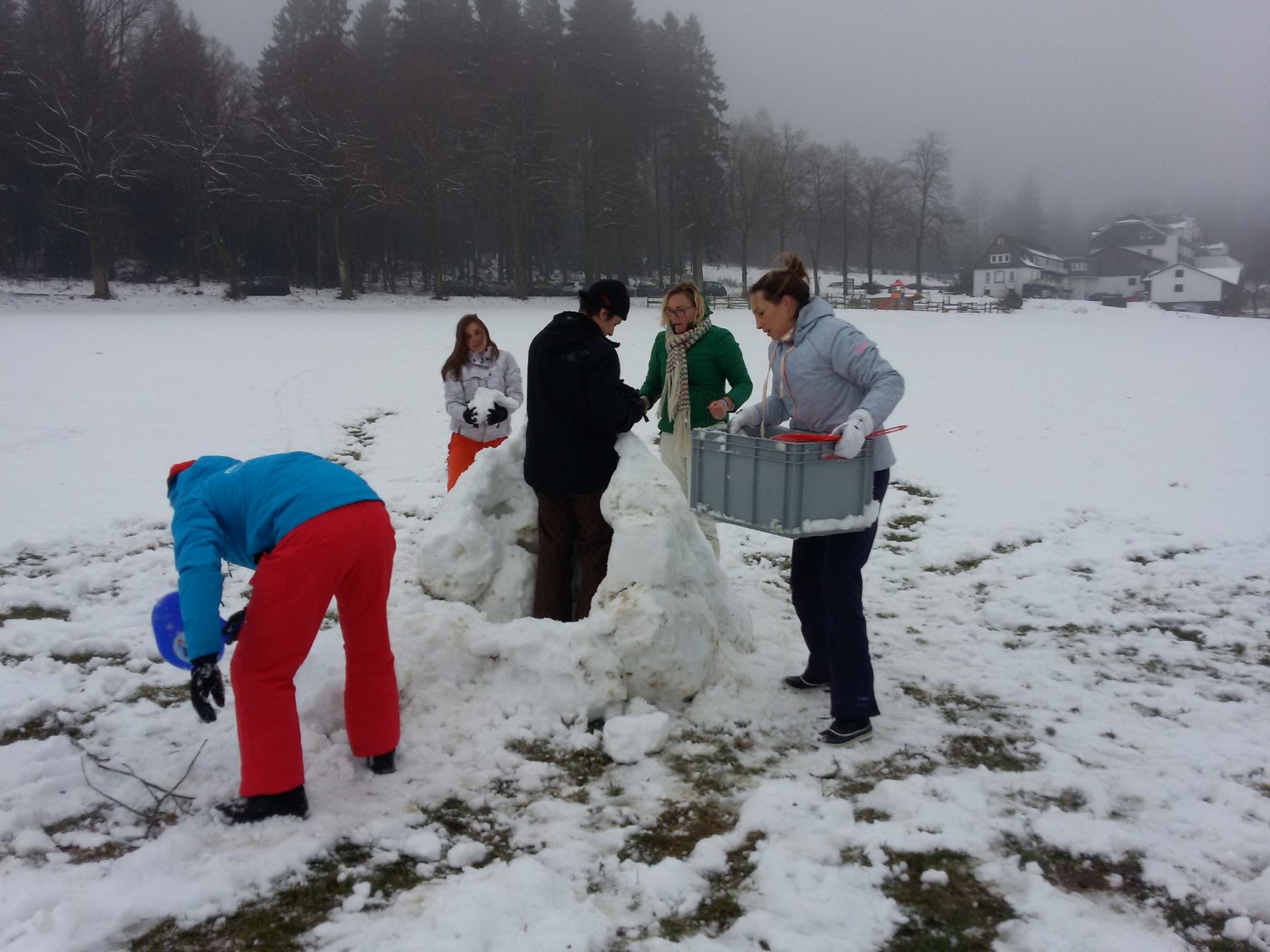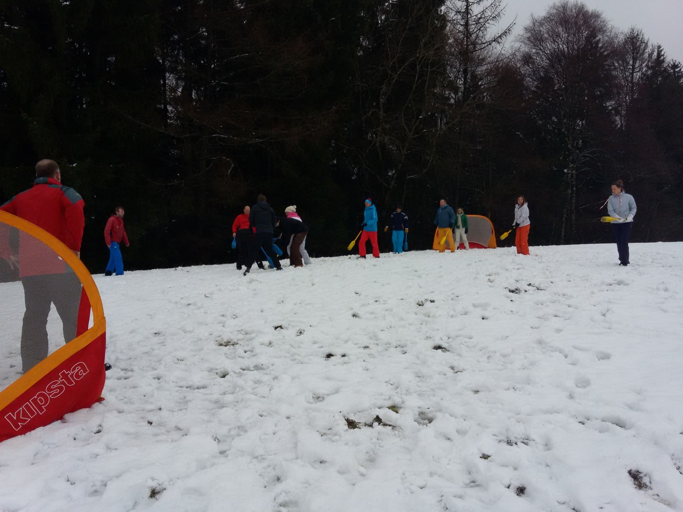 Velen waren maar nét op tijd om nog mee te kunnen feesten bij de après-ski, voor de bus weer naar het hotel ging om op te frissen voor het avondeten. Aansluitend nog een feestje bij Volldampf in Winterberg. En dan moe, maar voldaan naar bed. De volgende ochtend een sneeuwolympiade. Ik hoorde een hoop gekreun en gesteun bij het uitstappen van de auto’s… Stijf, spierpijn en waarschijnlijk had iedereen wel wat langer kunnen slapen. Maar eenmaal aan de gang met de spellen was dat allemaal snel vergeten. Wat een fanatisme! Iedereen was direct weer klaarwakker en actief/creatief.