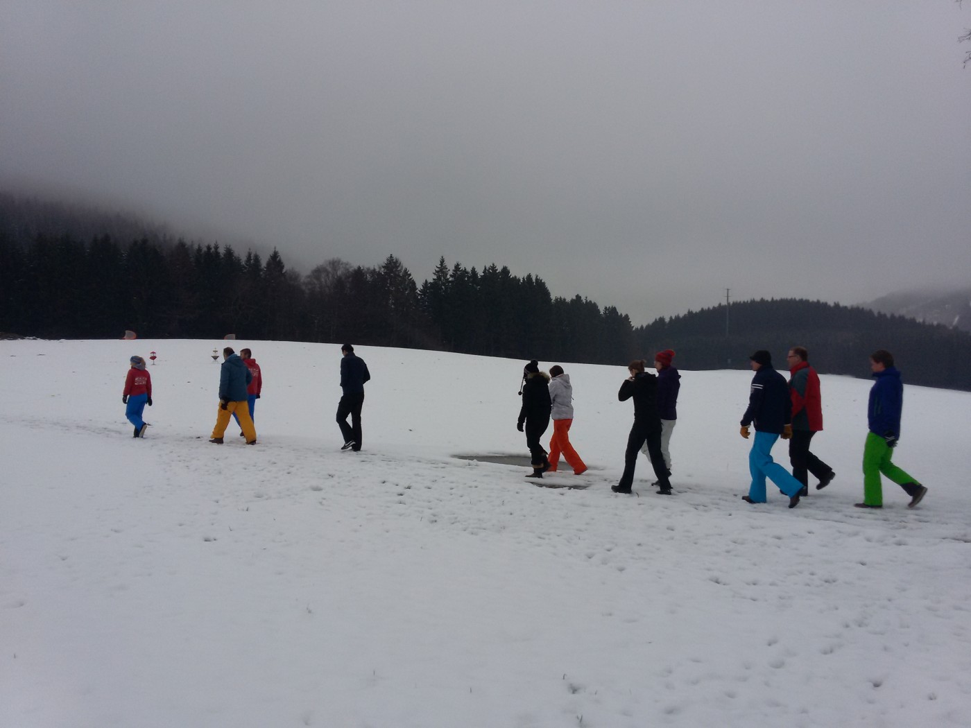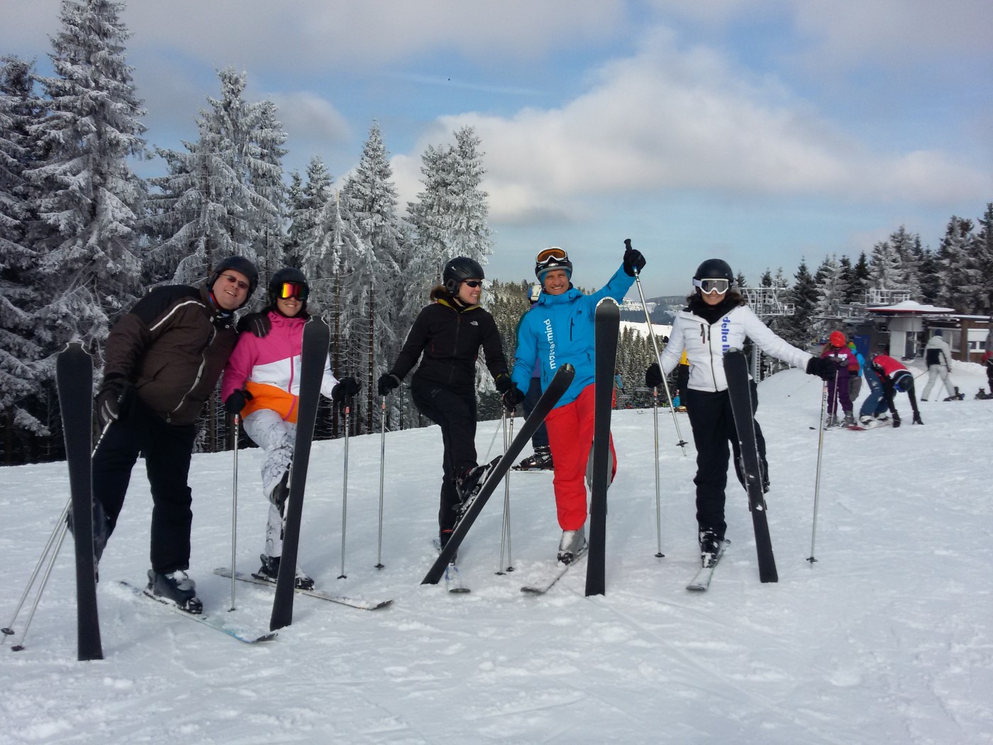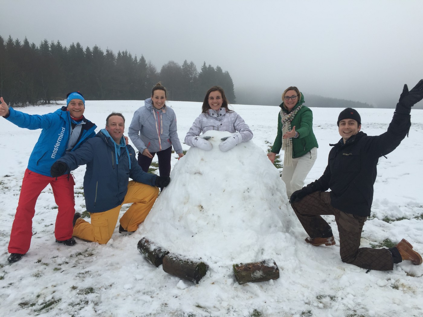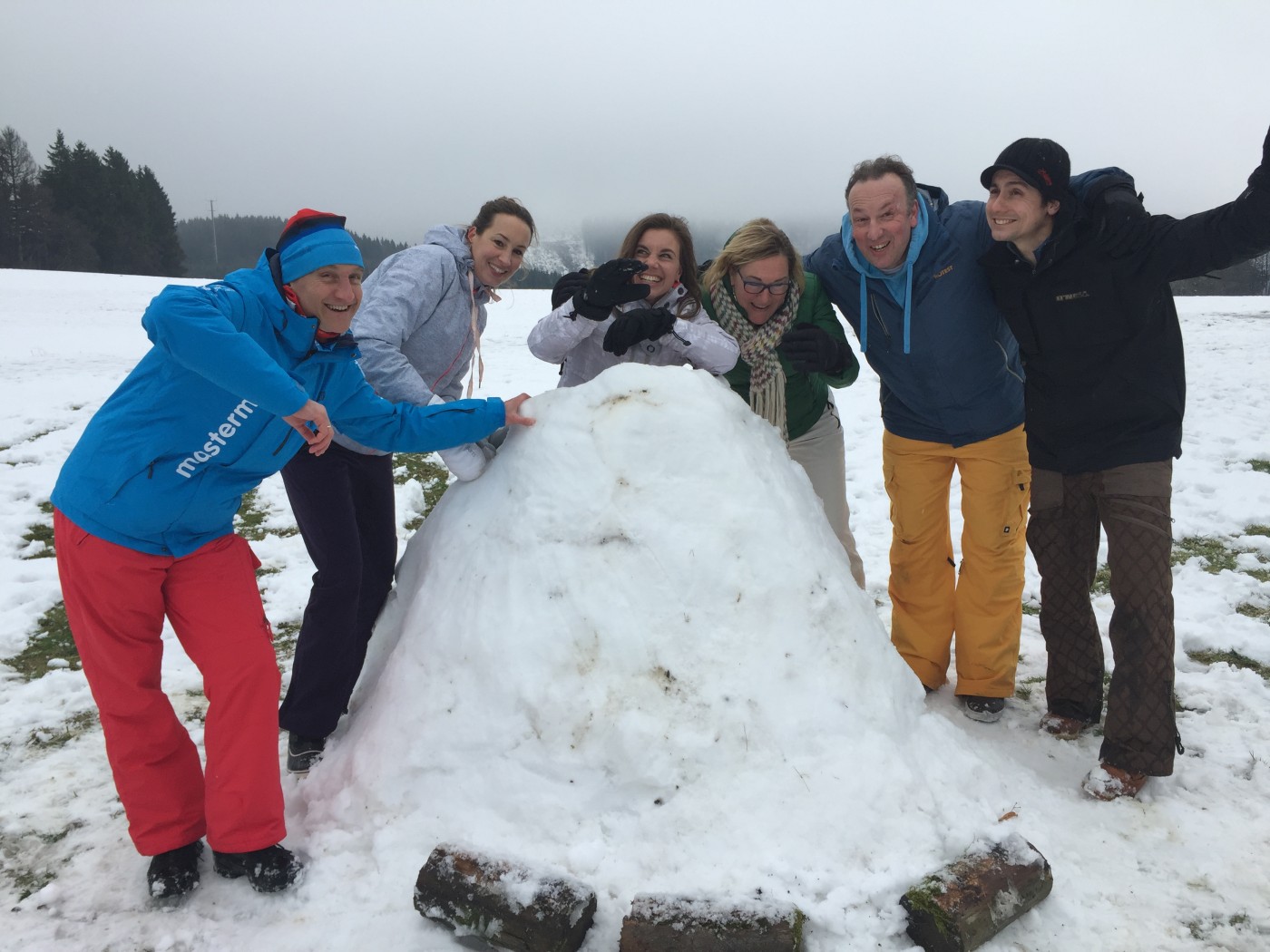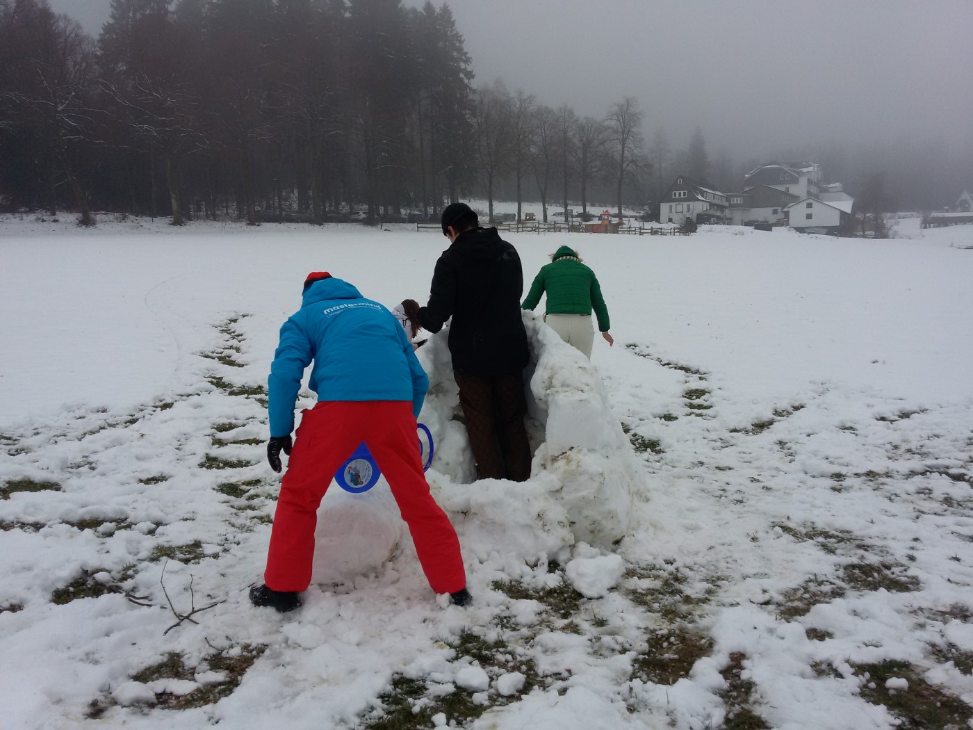 Velen waren maar nét op tijd om nog mee te kunnen feesten bij de après-ski, voor de bus weer naar het hotel ging om op te frissen voor het avondeten. Aansluitend nog een feestje bij Volldampf in Winterberg. En dan moe, maar voldaan naar bed. De volgende ochtend een sneeuwolympiade. Ik hoorde een hoop gekreun en gesteun bij het uitstappen van de auto’s… Stijf, spierpijn en waarschijnlijk had iedereen wel wat langer kunnen slapen. Maar eenmaal aan de gang met de spellen was dat allemaal snel vergeten. Wat een fanatisme! Iedereen was direct weer klaarwakker en actief/creatief.