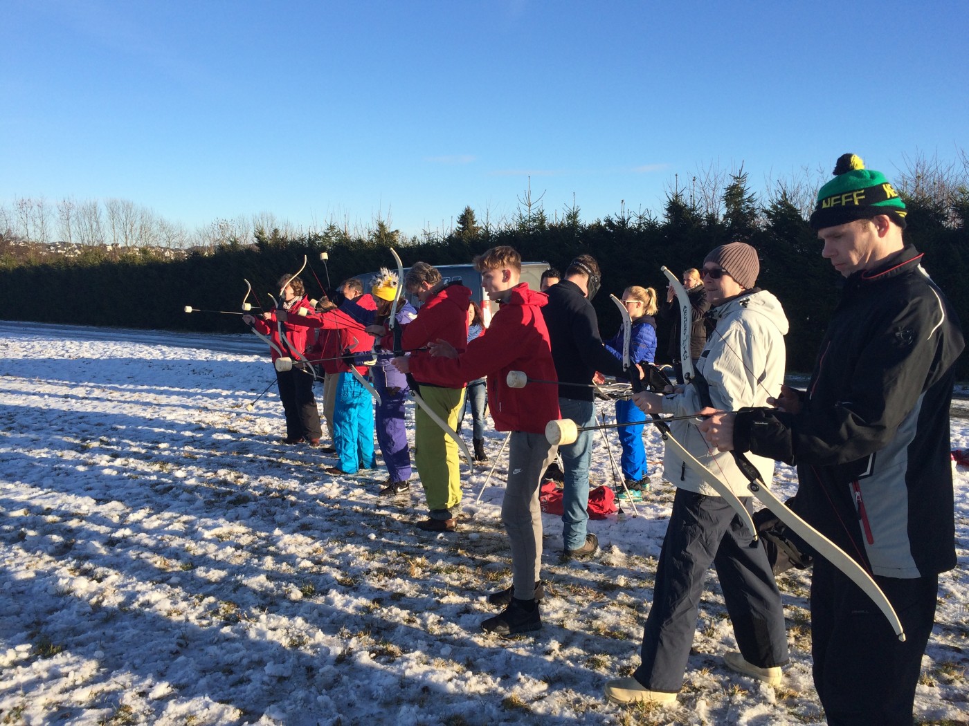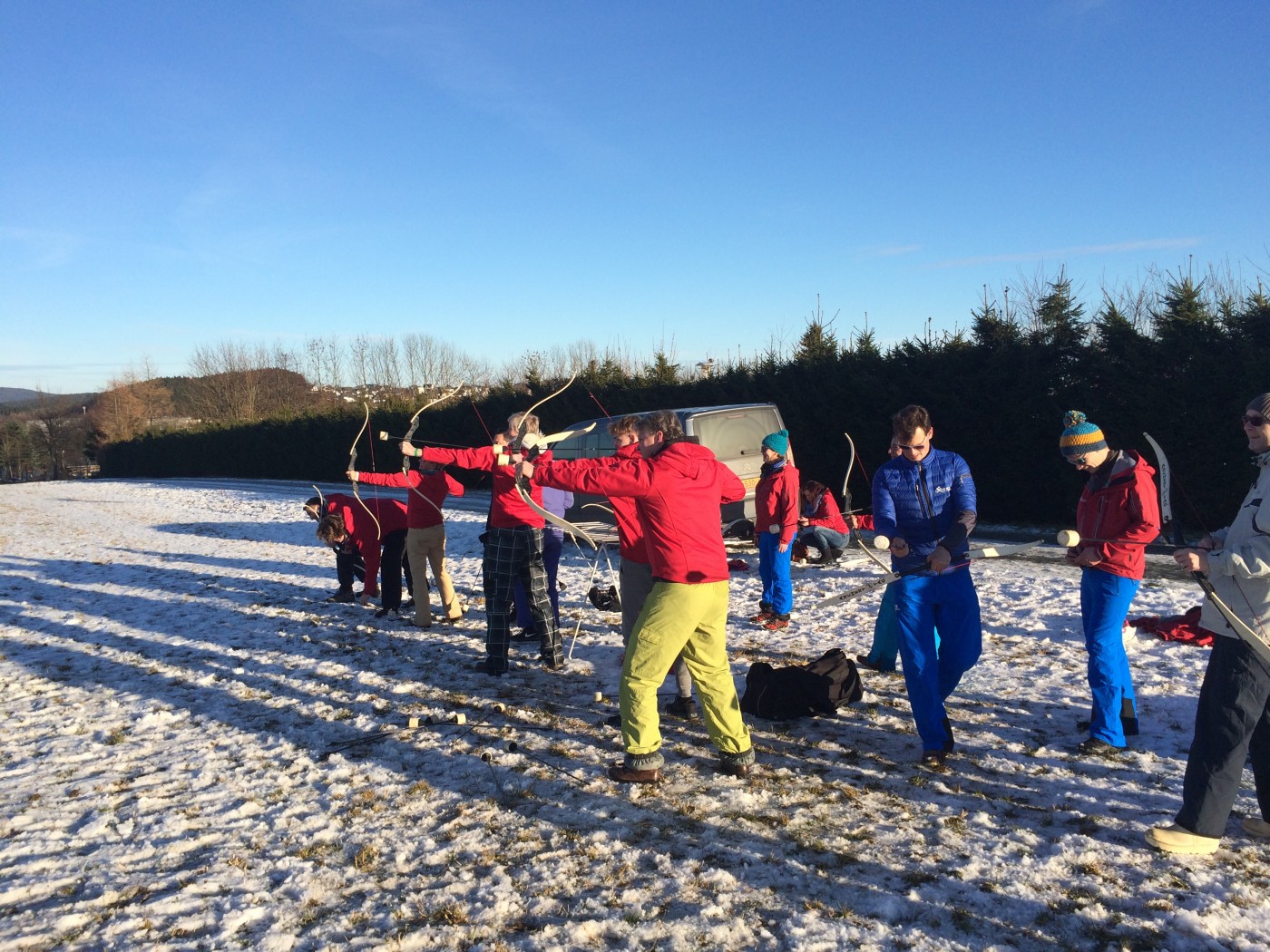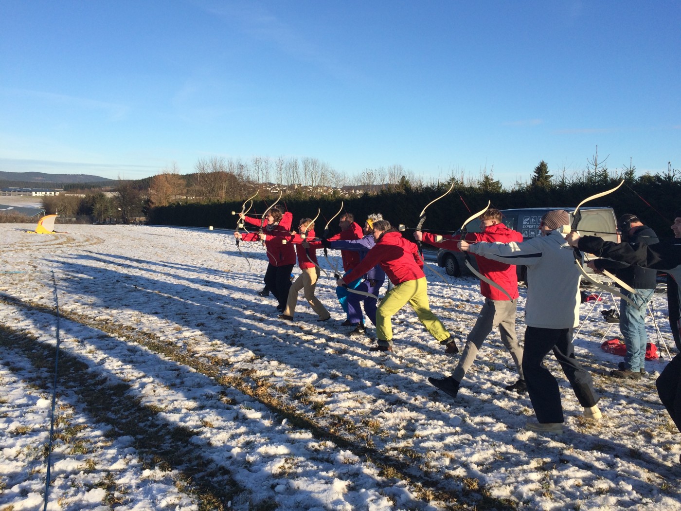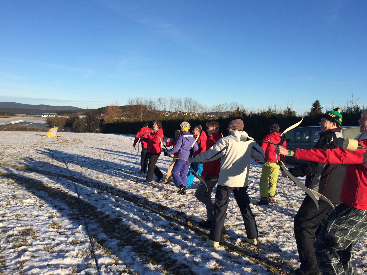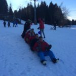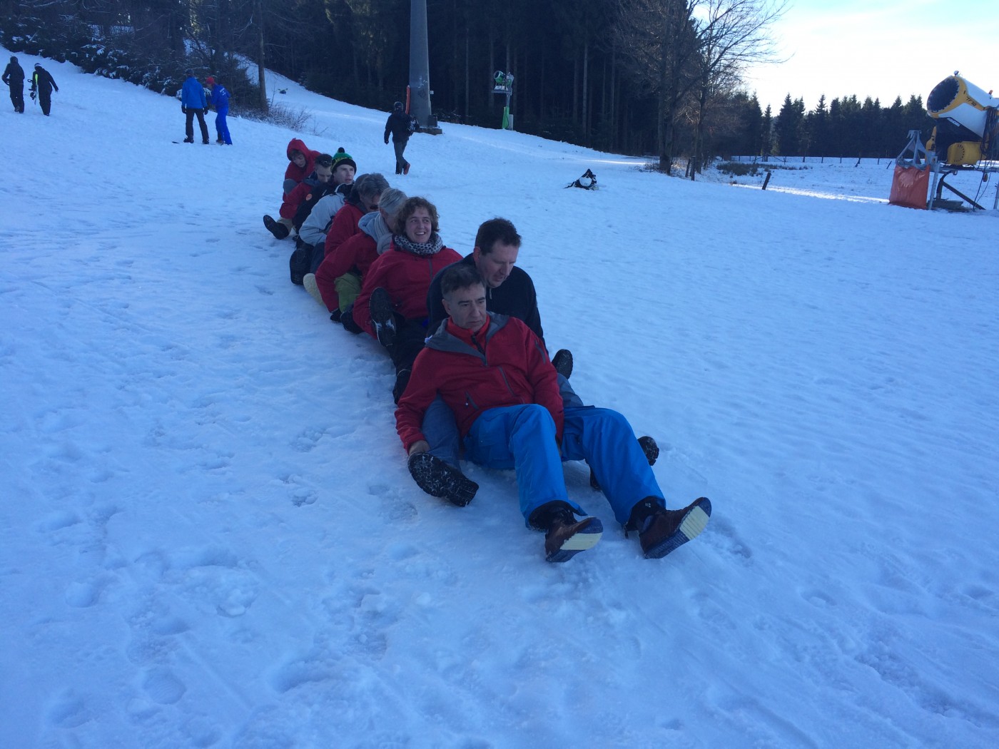 Na de lunch nemen sommige toch nog een extra lesje bij Jop of Sofia en de anderen gaan mee op een mooie wandeltocht naar de schans. Hier heb je een geweldig uitzicht over heel Winterberg en de Bobbaan. Over de piste gaan we natuurlijk niet terug wandelen want we hebben de bilslee mee. Tijd voor de grote bilslee wedstrijd. Mario lag eerst op kop maar werd toch ingehaald door de slee profi Renate. Maar zij kon later weer terug gepakt worden bij het spannende ArcheryTag. Eerst waren Paul en Robbie de klos om als aas te gaan staan maar gelukkig waren zij goed in pijlen vangen en mochten zij in no time ook weer schieten op hun collega’s. Een paar spannende potjes Archerytag gespeeld en daarna tijd voor de apres ski.